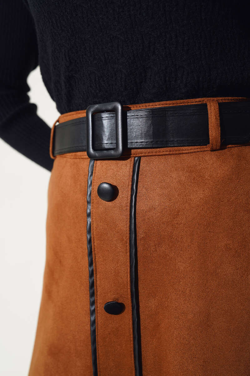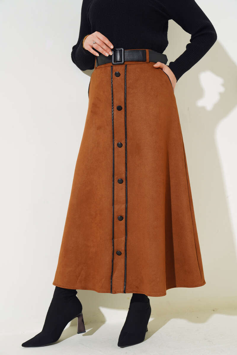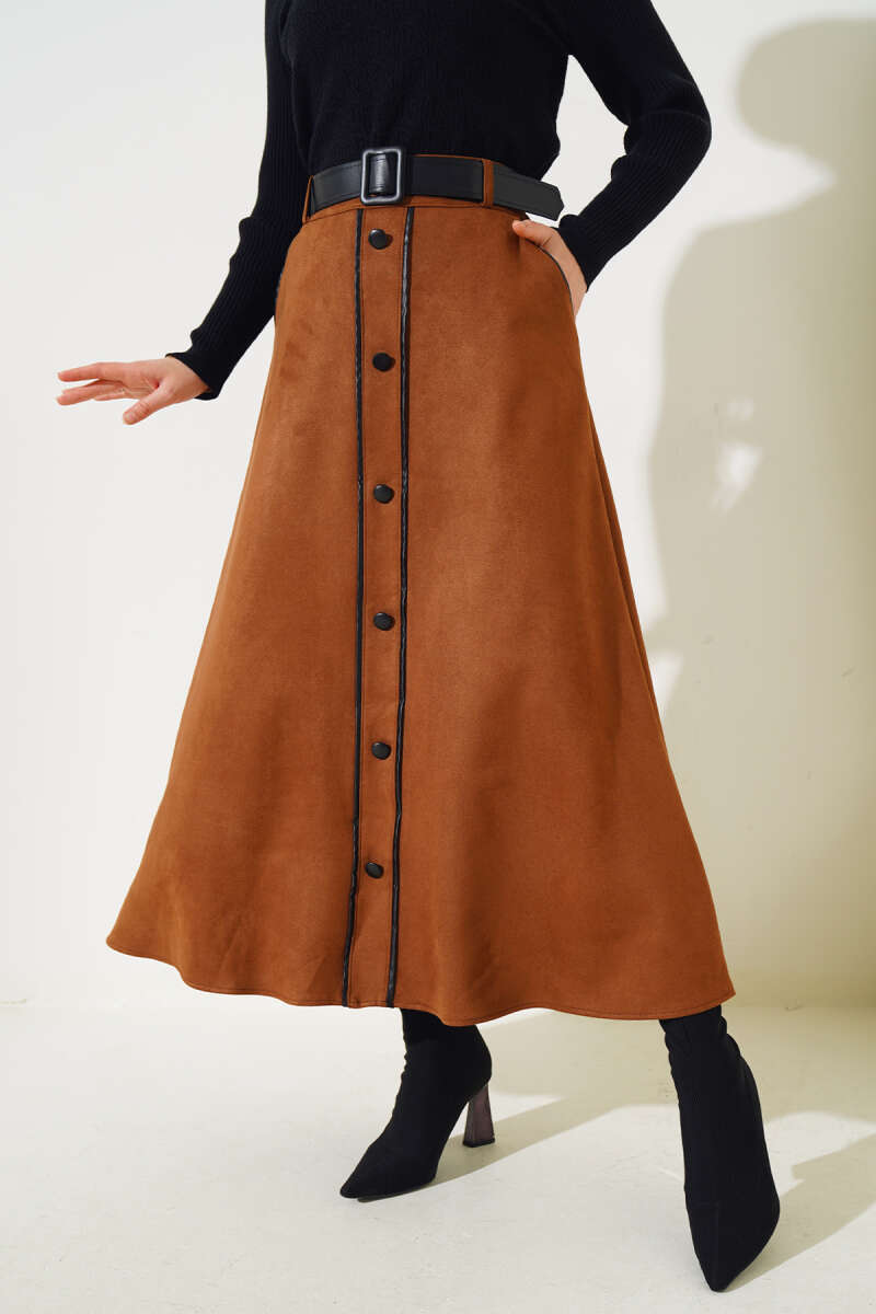 Kemer Aksesuarlı Ekoseli Etek Haki