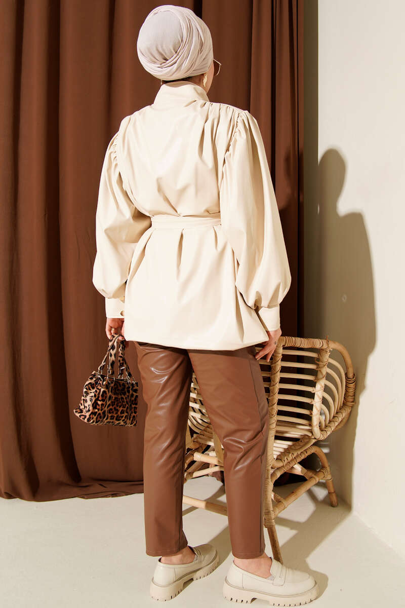 Kemerli Düğmeli Deri Ceket Haki