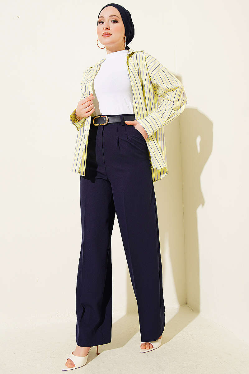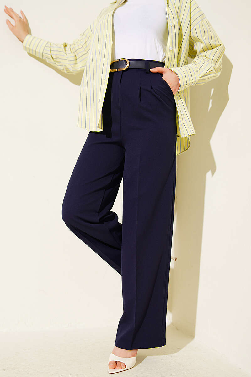 Kemerli Düğmeli Geniş Paça Pantolon Lacivert