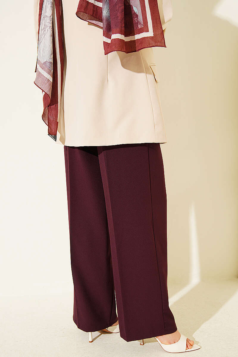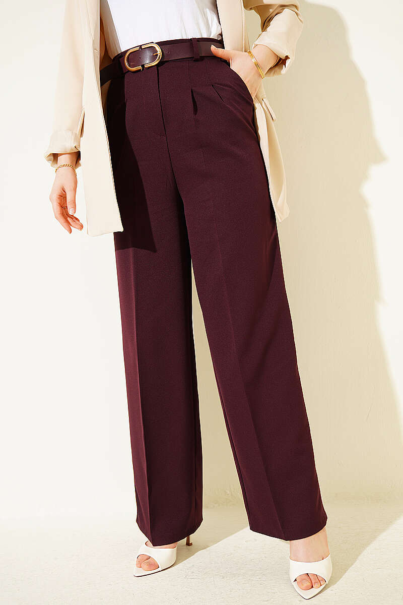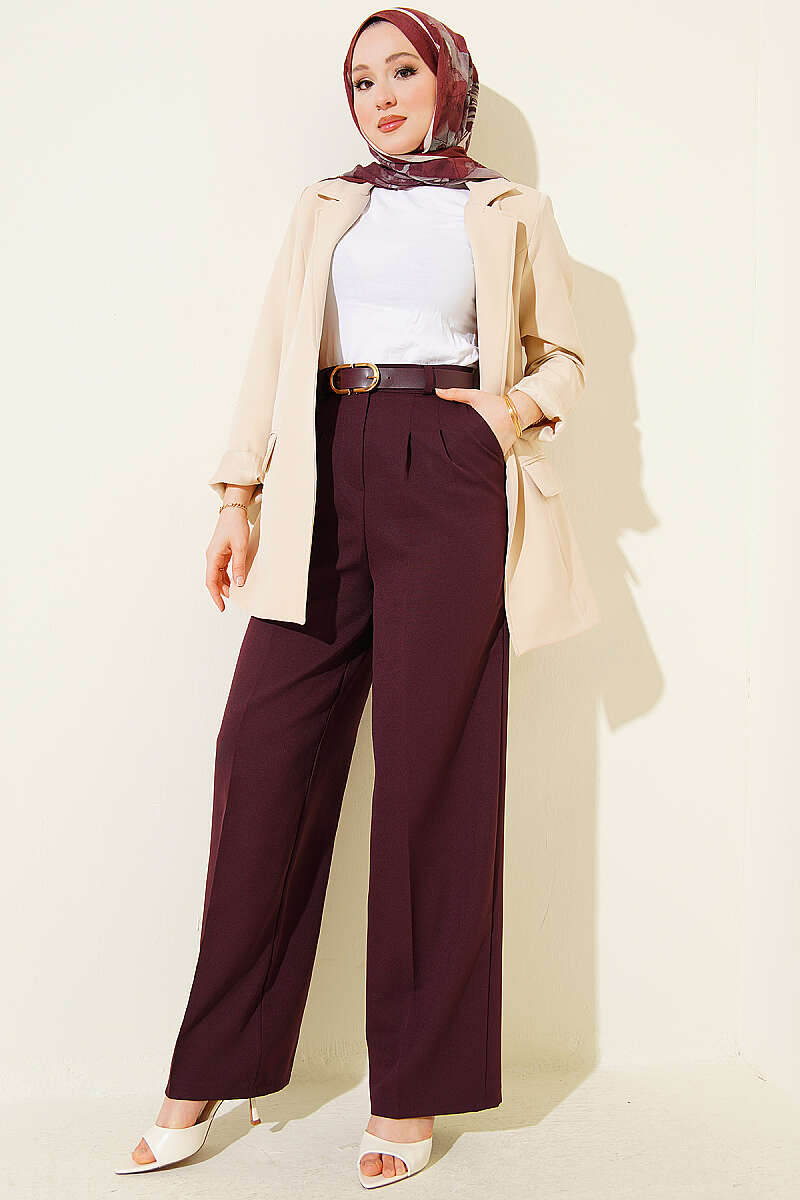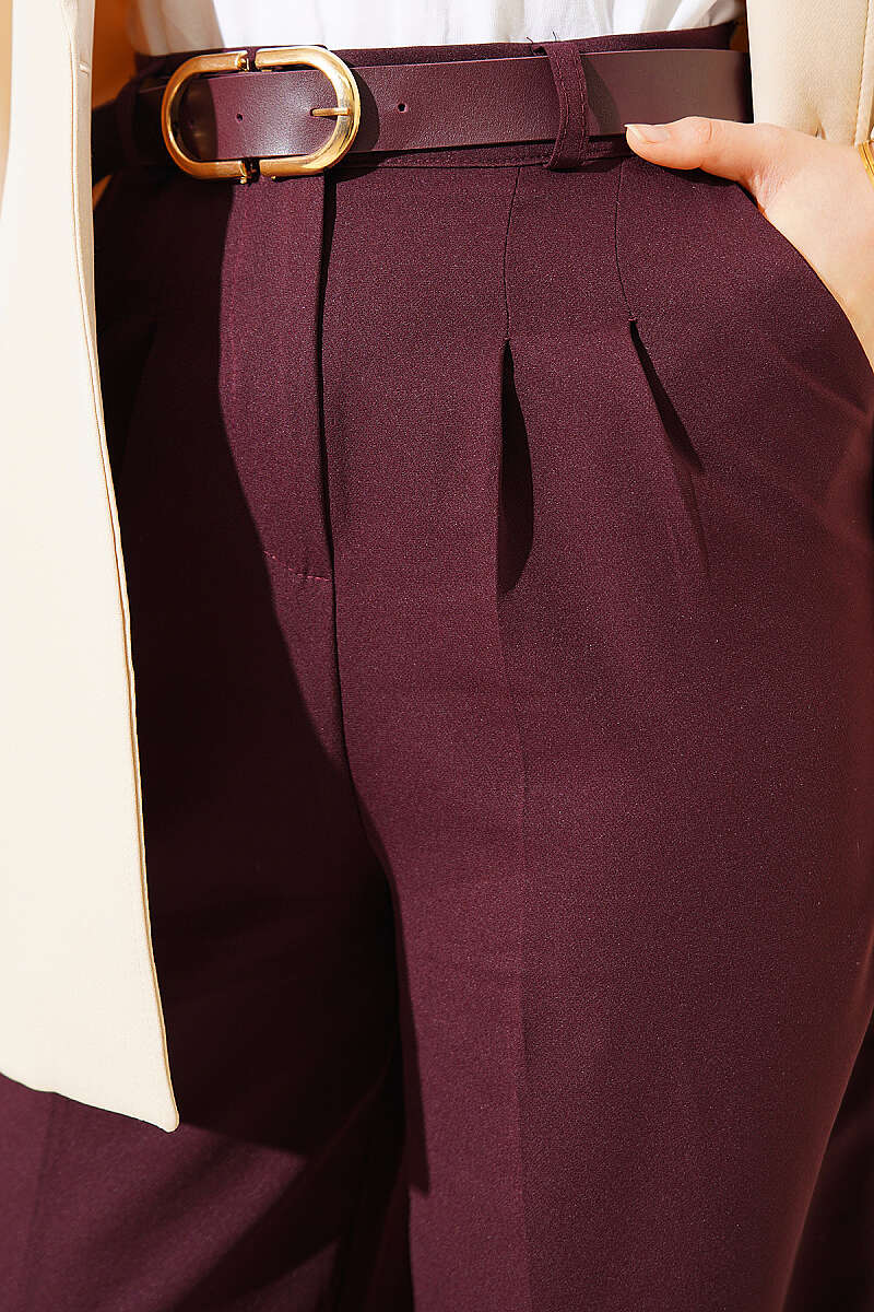 Kemerli Düğmeli Geniş Paça Pantolon Mürdüm