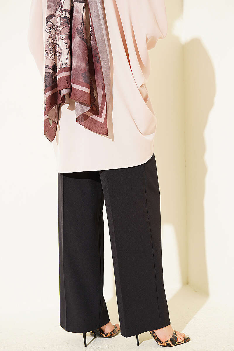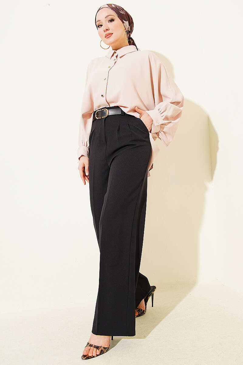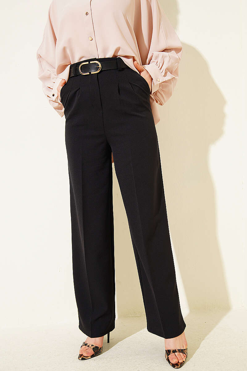 Kemerli Düğmeli Geniş Paça Pantolon Siyah