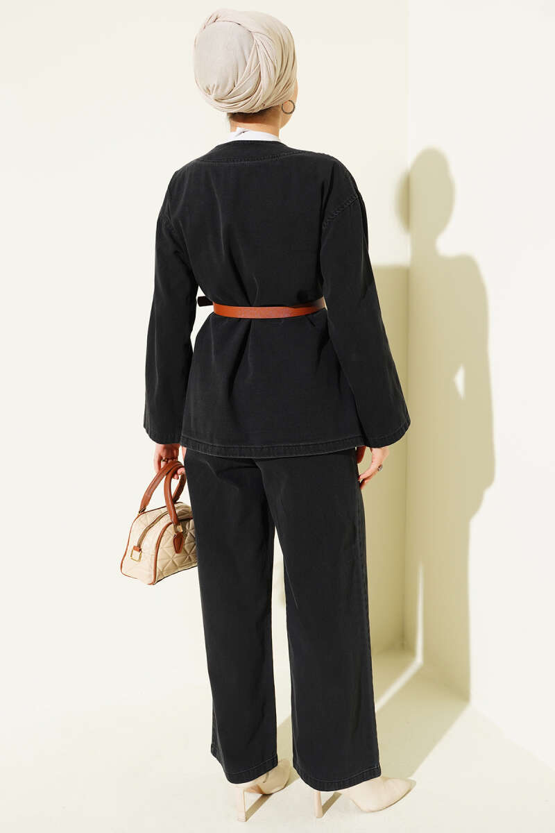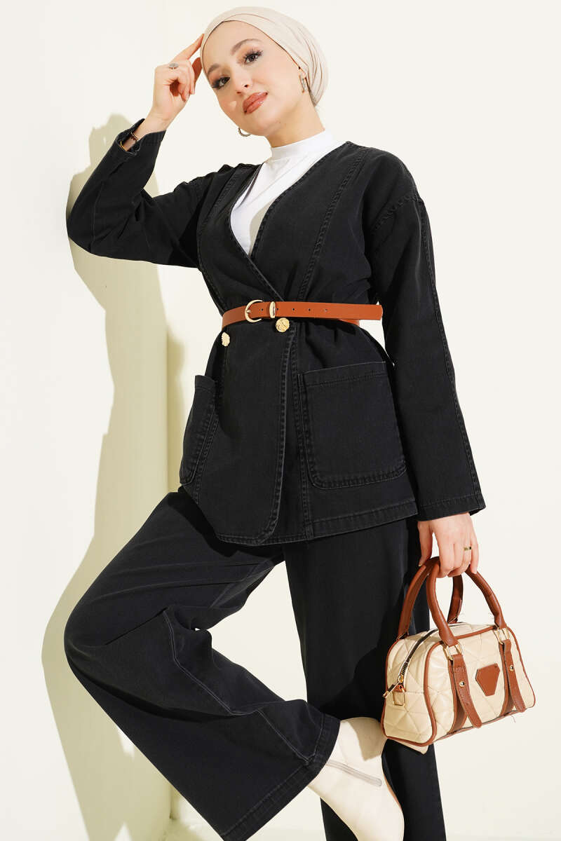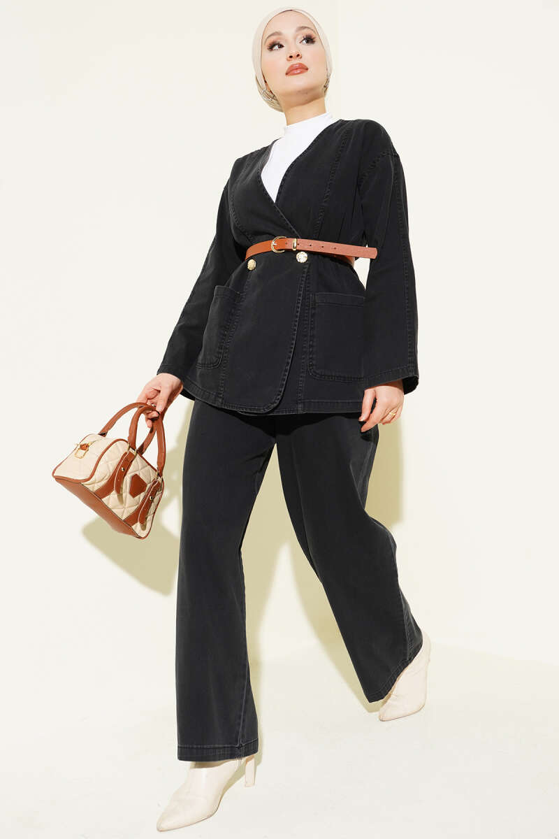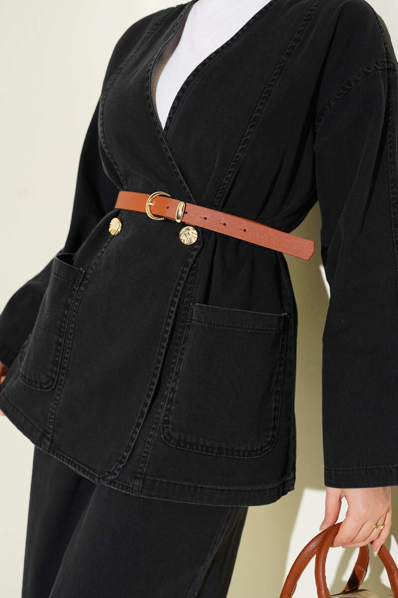 Kemerli Çıtçıtlı Ceket İkili Takım Kahve