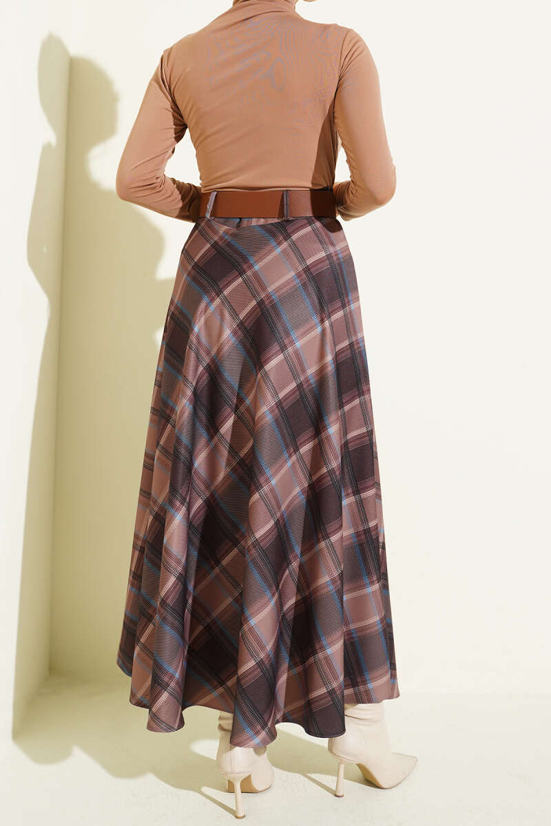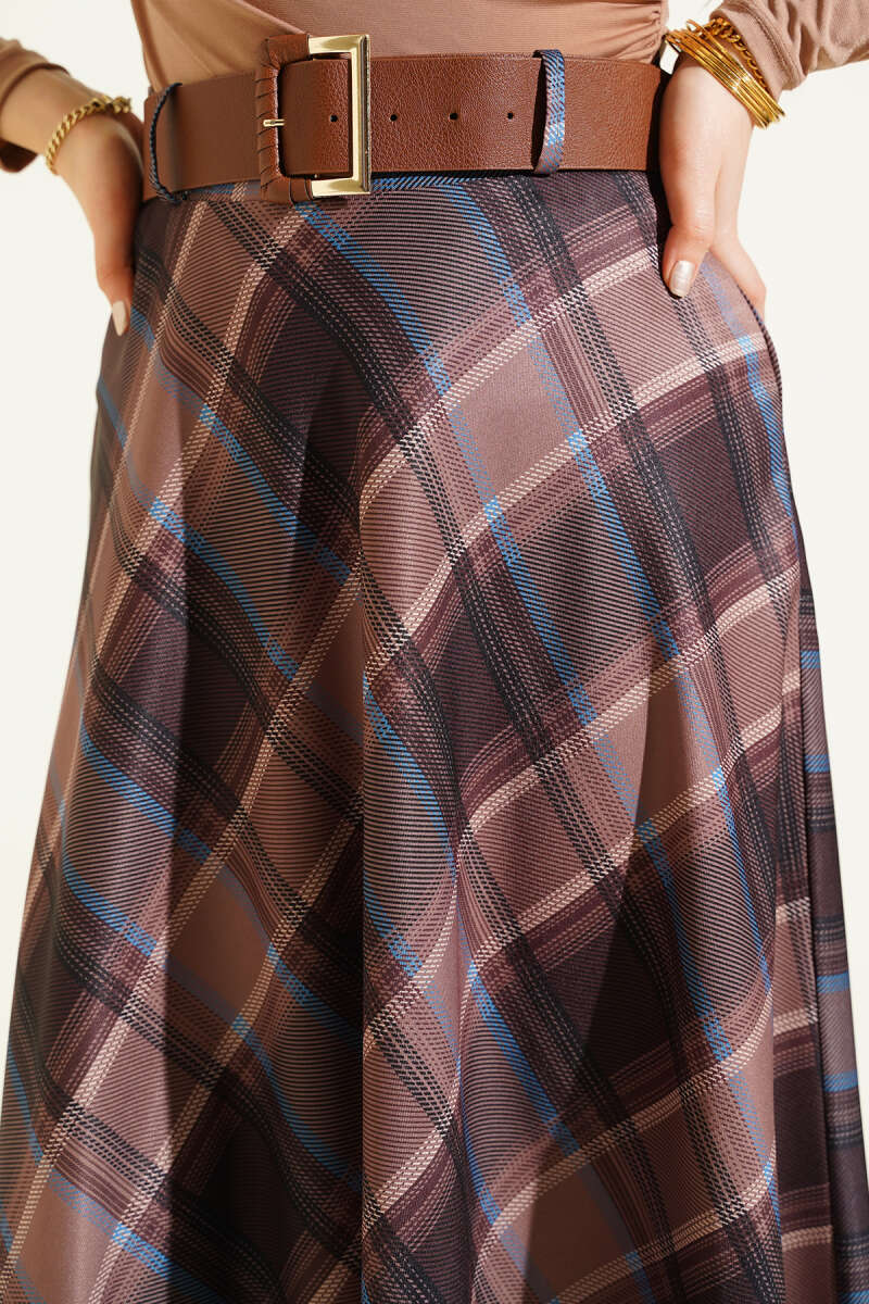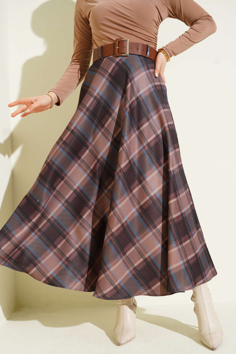 Ekose Desenli Kloş Kaşe Etek Kahve