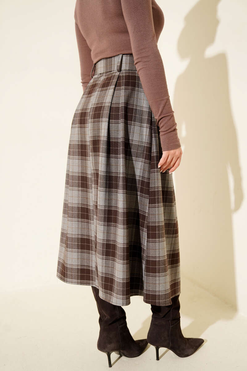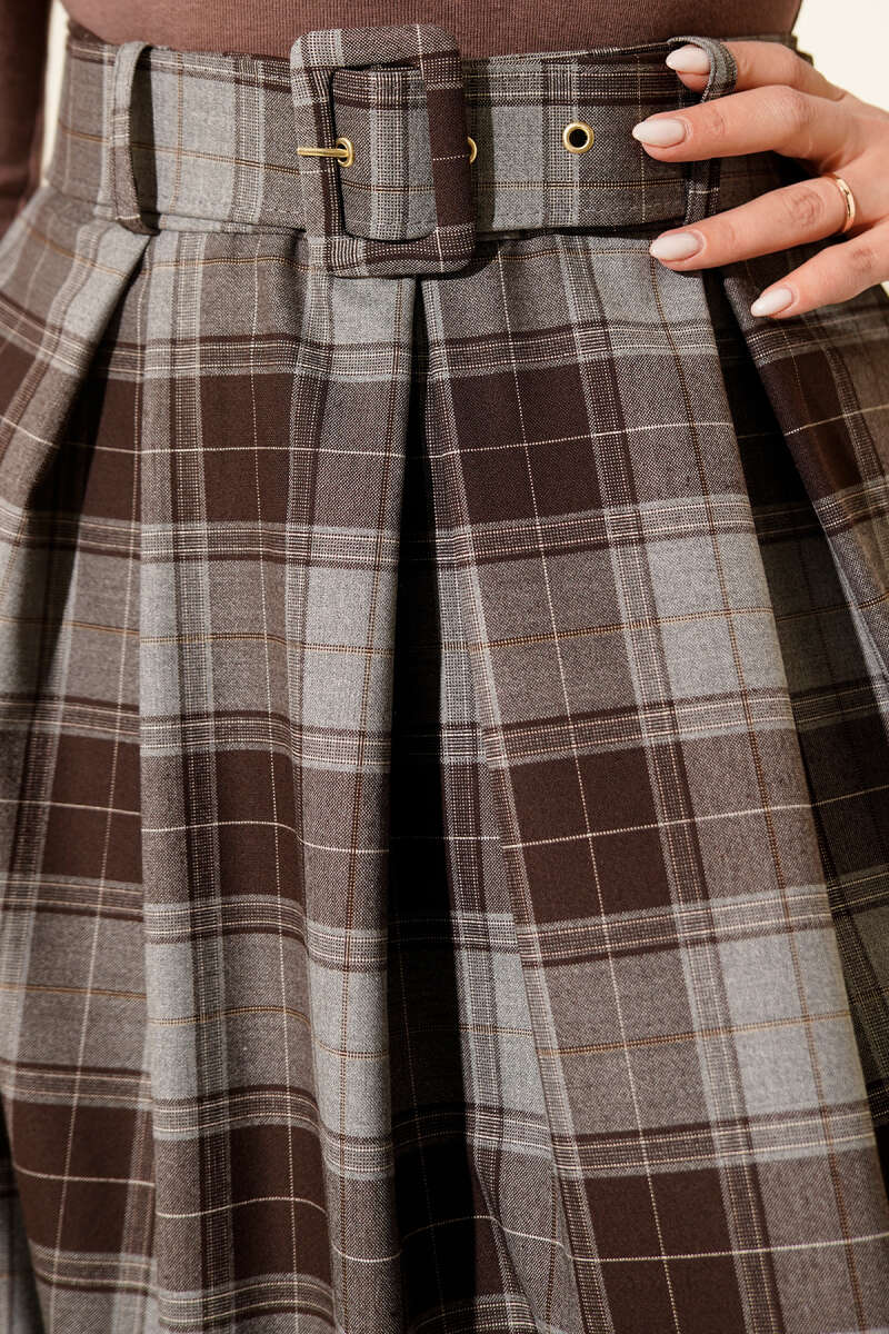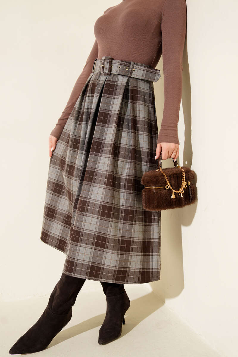 Kemerli Ekoseli Şifon Etek Kahve