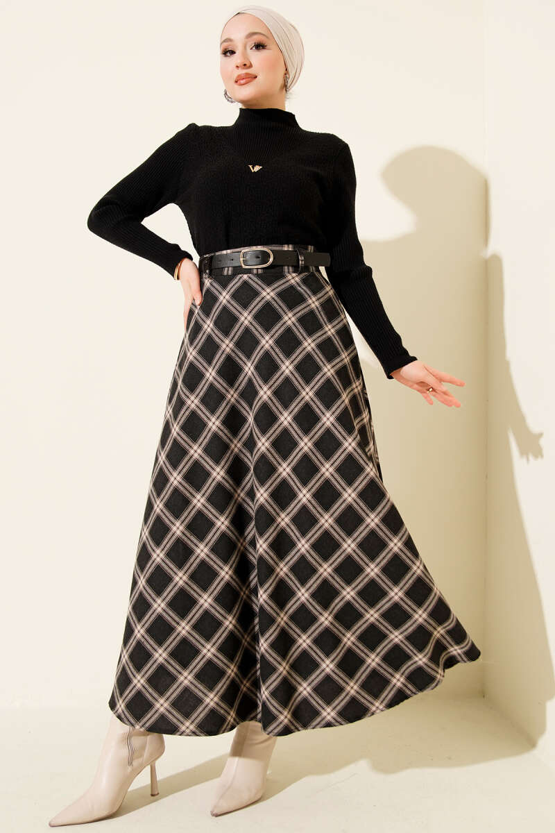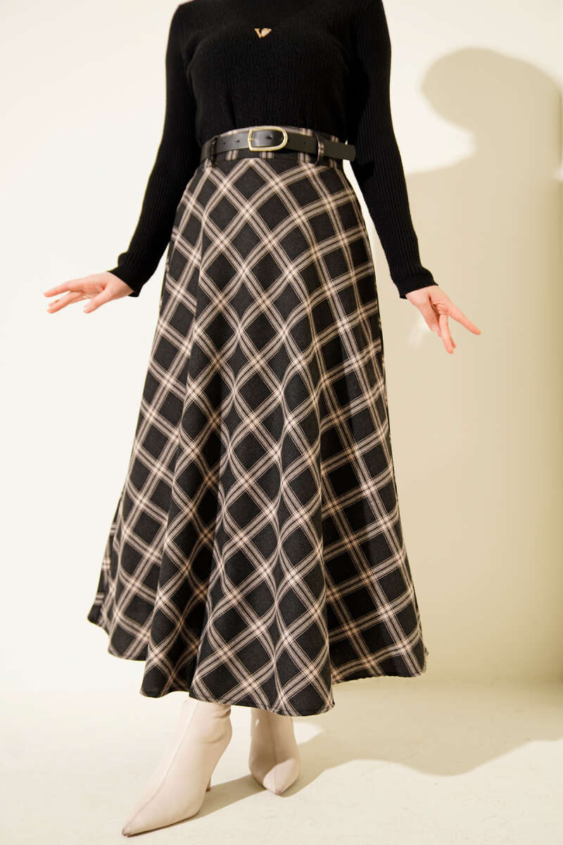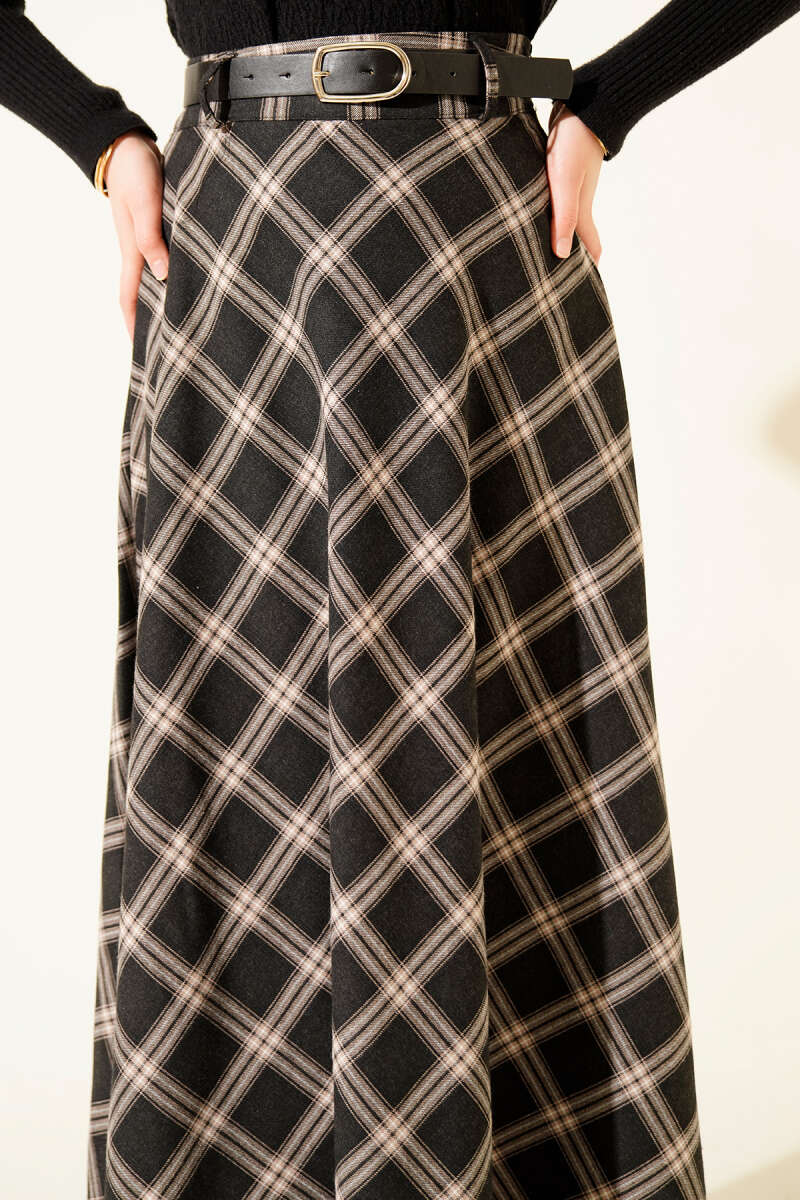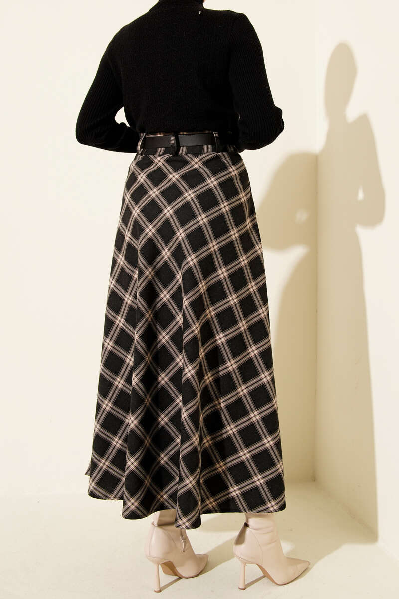 Kemerli Ekose Desenli Etek Kahve
