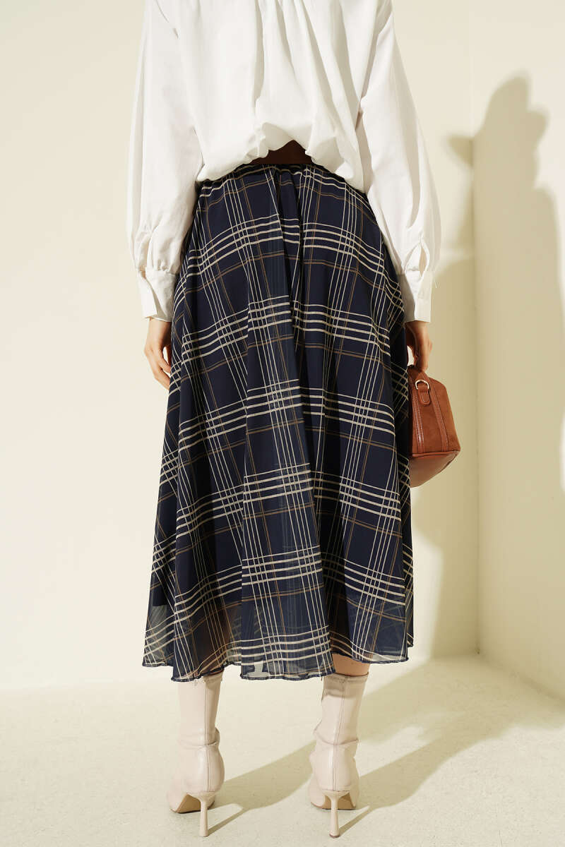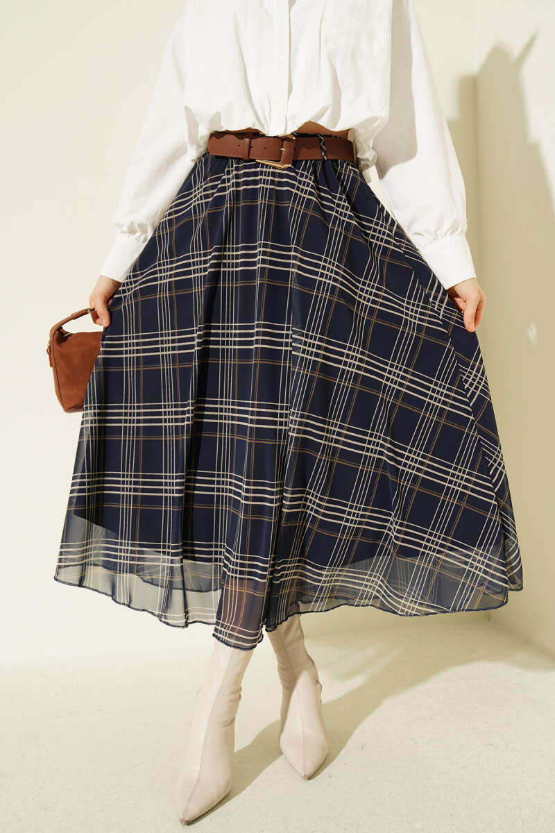 Kemerli Ekoseli Şifon Midi Etek Lacivert