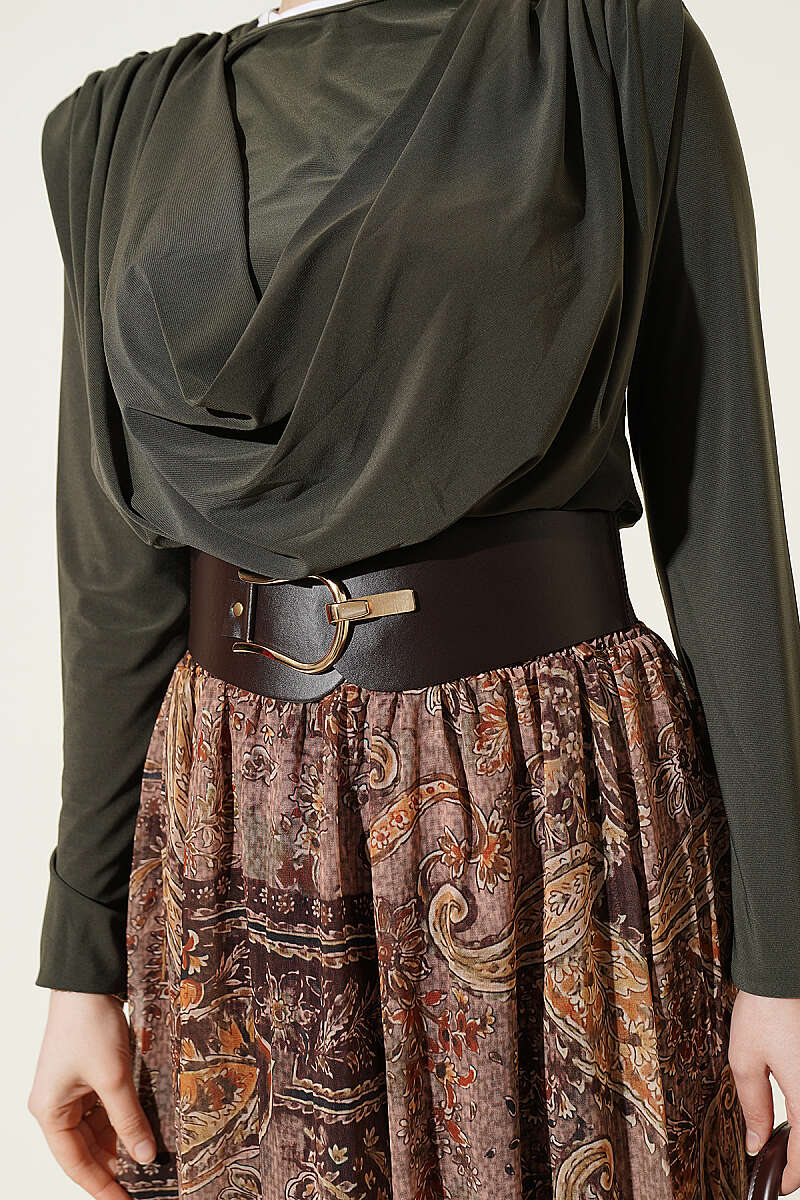 Kruvaze Yaka Kuşaklı Yelekli Takım Kahve