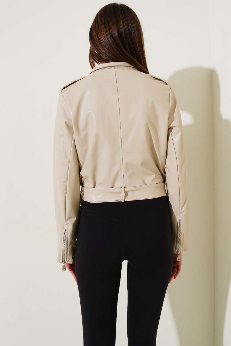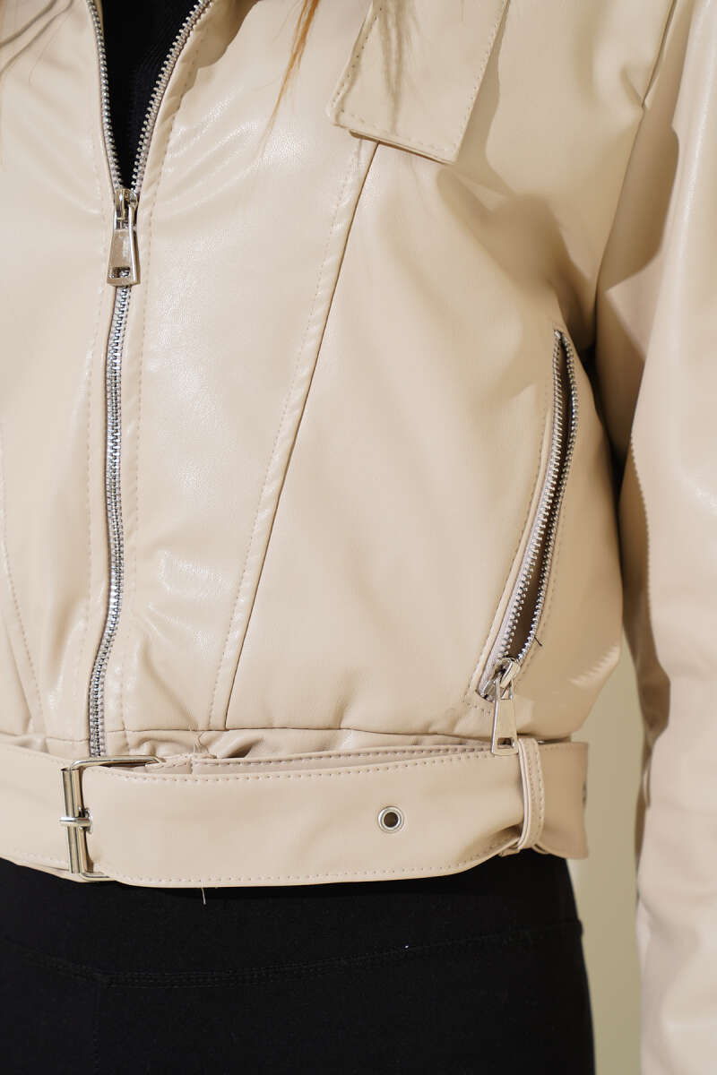 Göğüs Armalı Kısa Peluş Ceket Ekru
