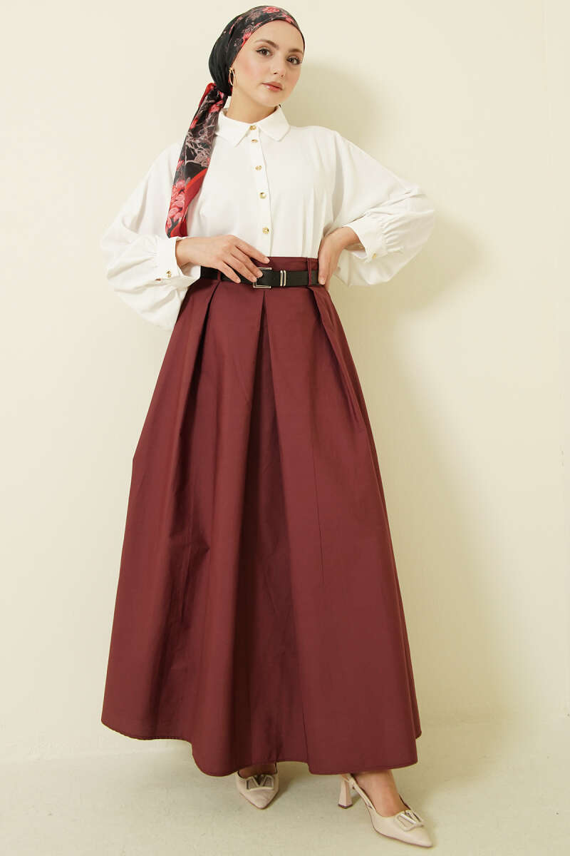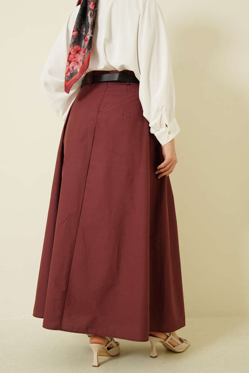 Kemerli Geniş Pileli Poplin Etek Bordo