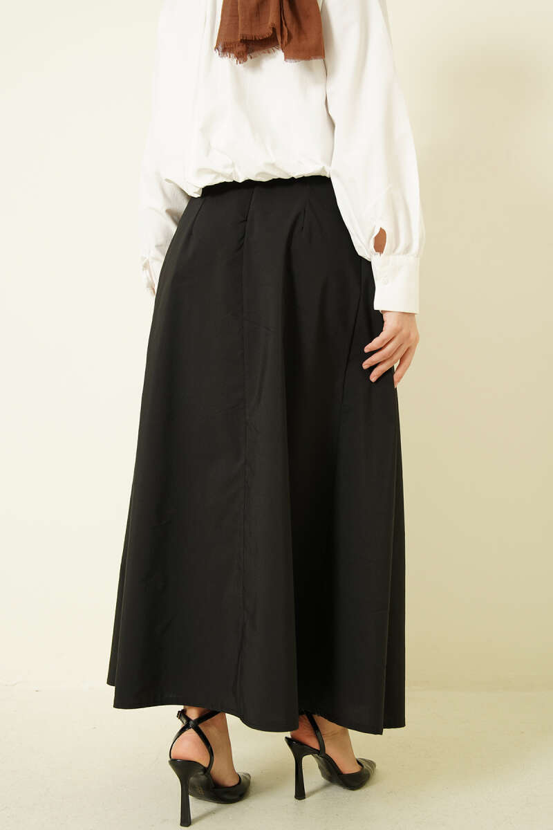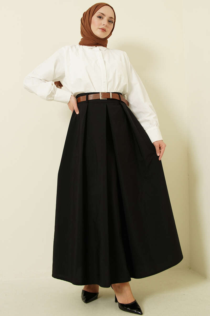 Kemerli Geniş Pileli Poplin Etek Siyah