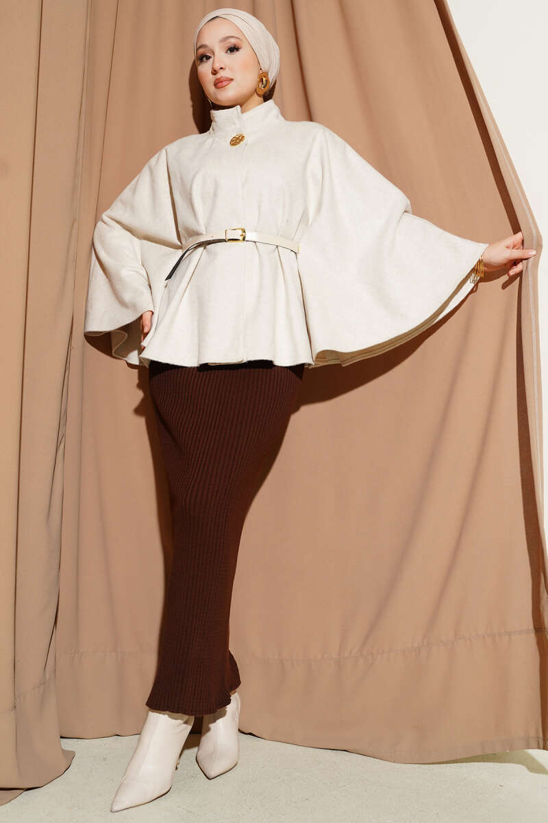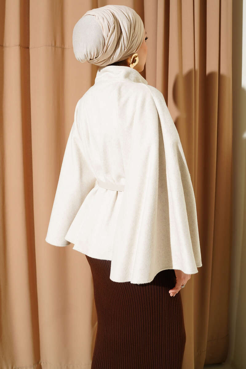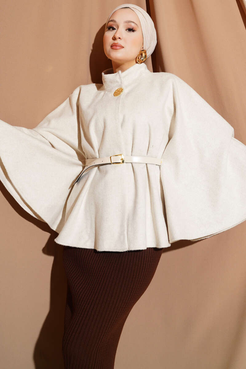 Kemerli Gömlek Yaka Kaşe Panço Bej
