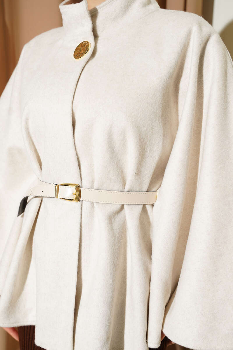 Kemerli Gold Düğmeli Kaşe Panço Vizon