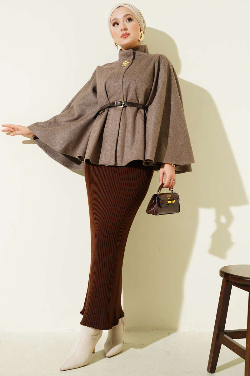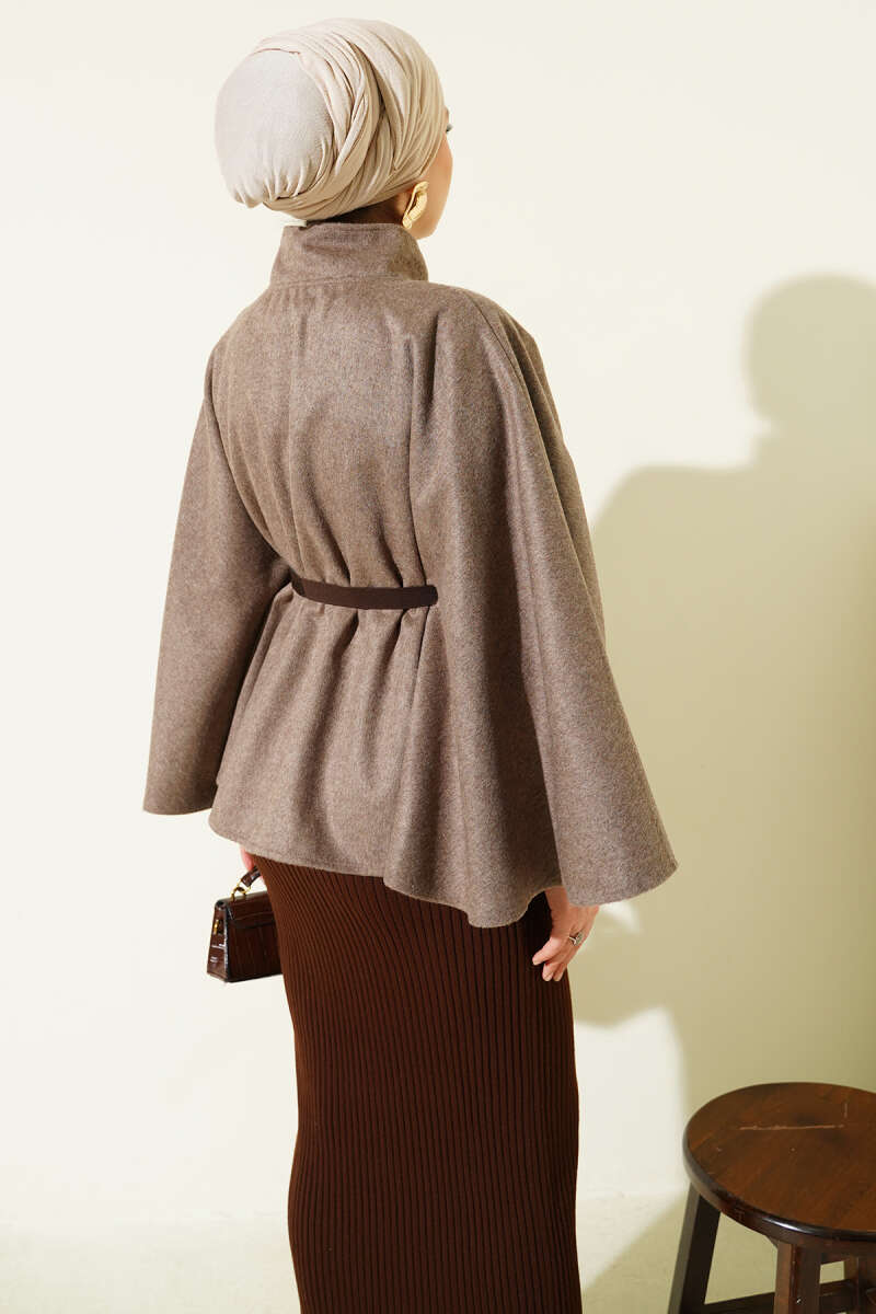 Kemerli Gömlek Yaka Kaşe Panço Vizon