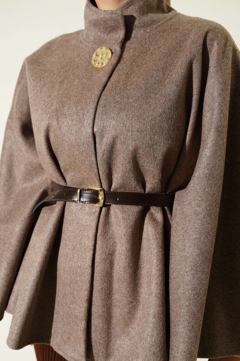 Kemerli Gold Düğmeli Kaşe Panço Bej