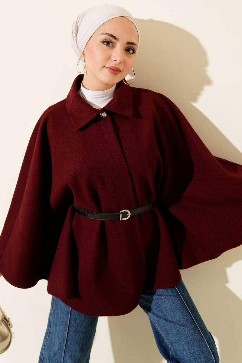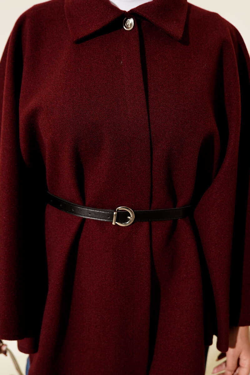 Tek Düğmeli Kemerli Kaşe Panço Kırmızı