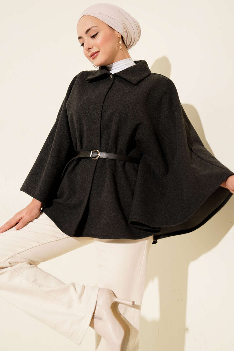 Kemerli Gömlek Yaka Kaşe Panço Siyah
