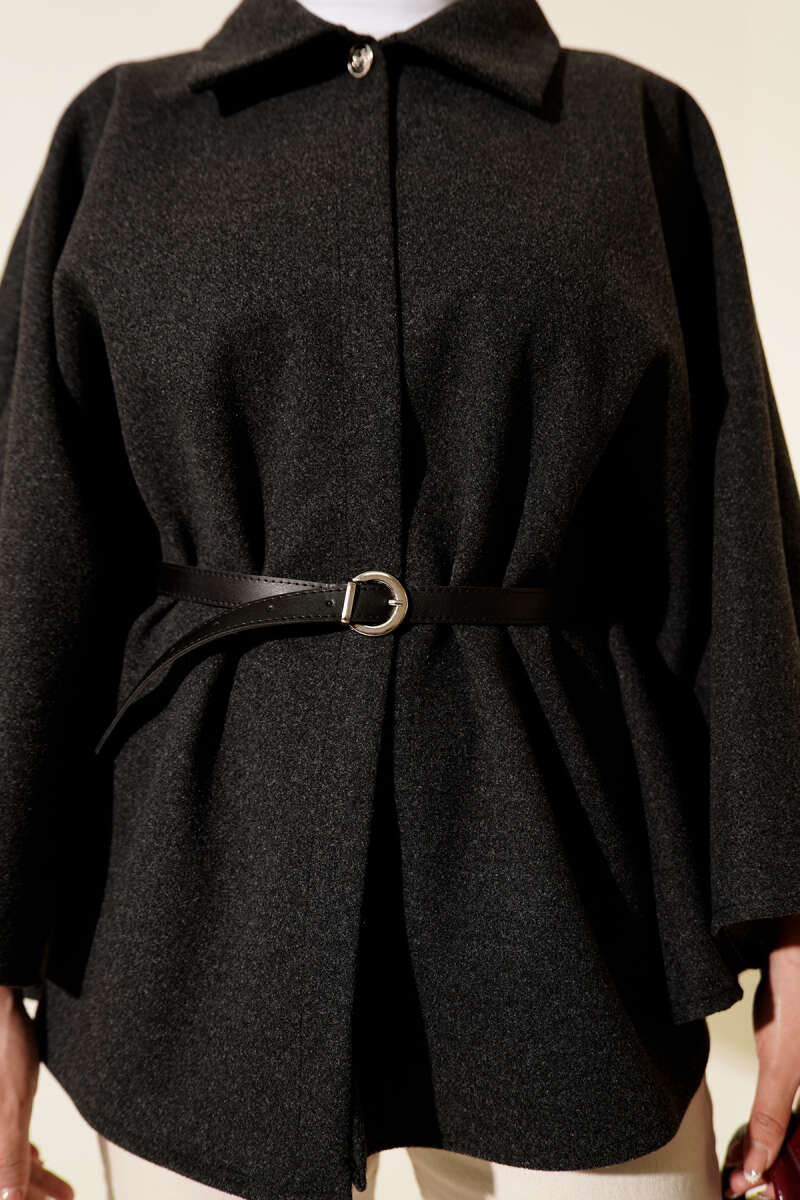 Kemerli Gold Düğmeli Kaşe Panço Antrasit