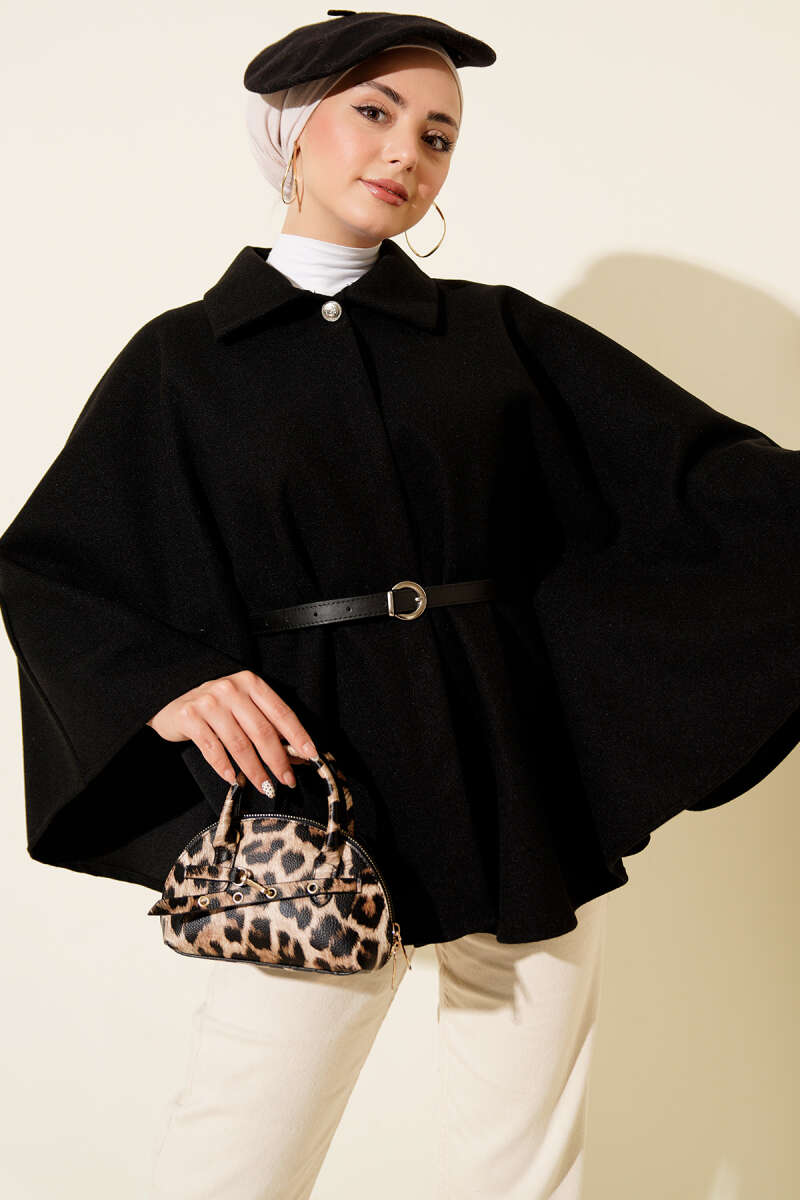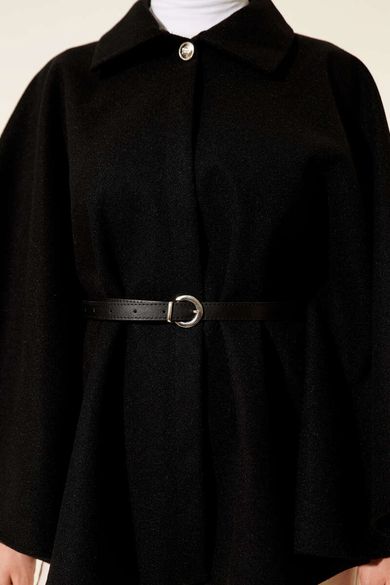 Kemerli Gold Düğmeli Kaşe Panço Siyah