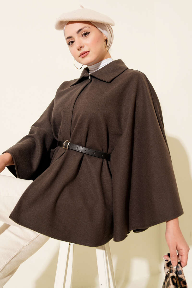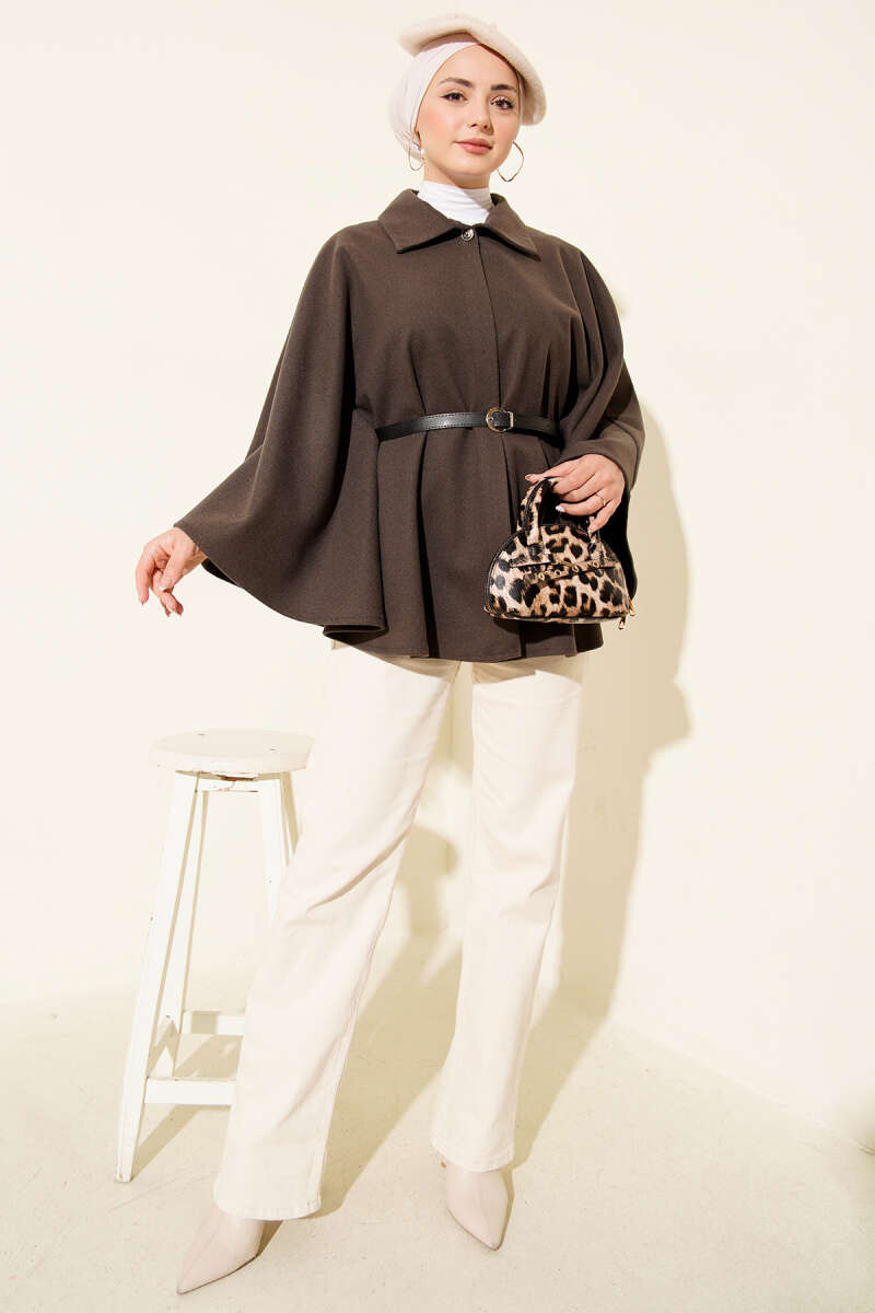 Kemerli Gömlek Yaka Kaşe Panço Füme
