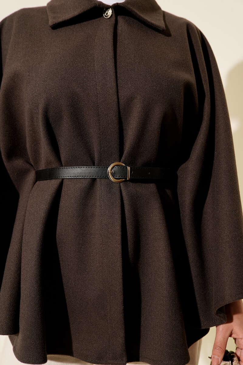Tek Düğmeli Kemerli Kaşe Panço Taba