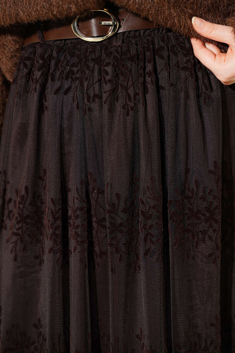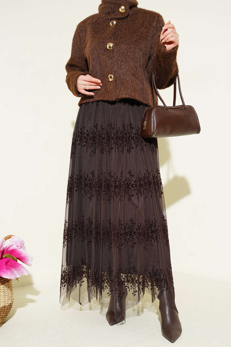 Desenli Asimetrik Kemerli Tül Etek Kahve