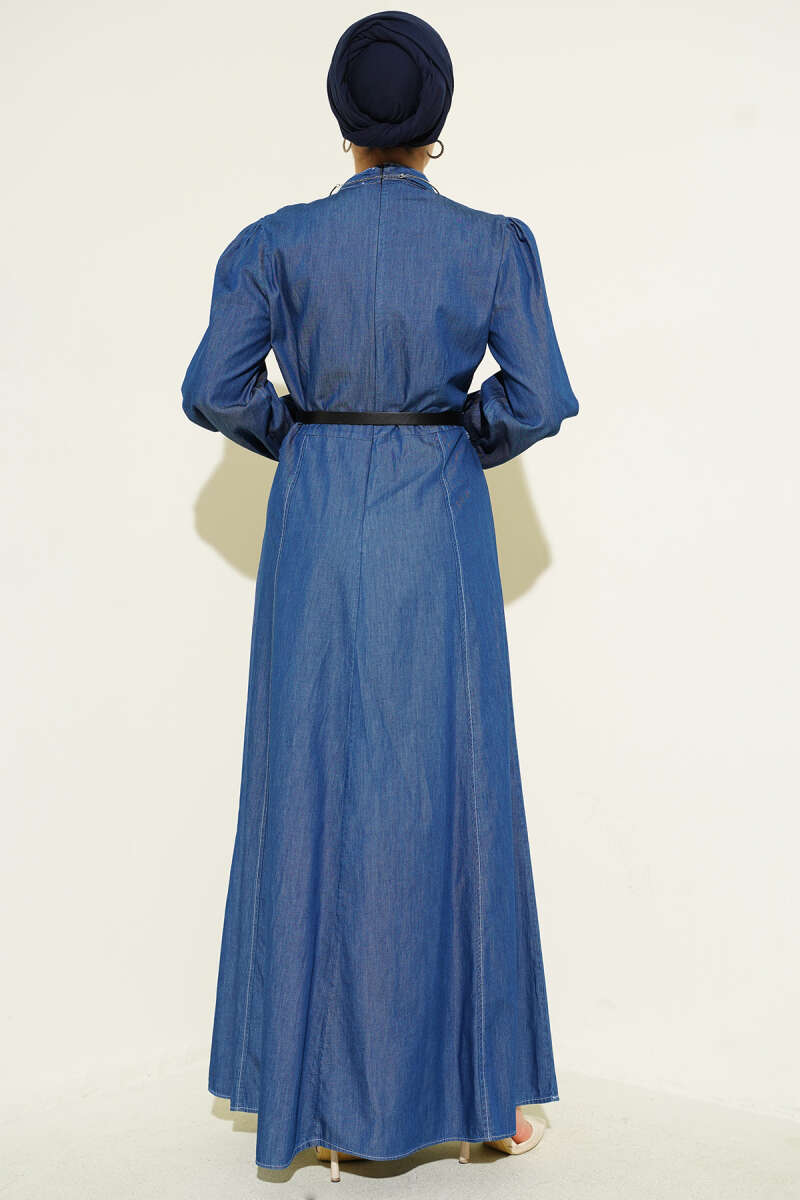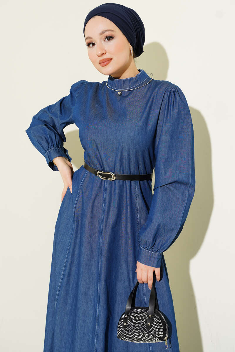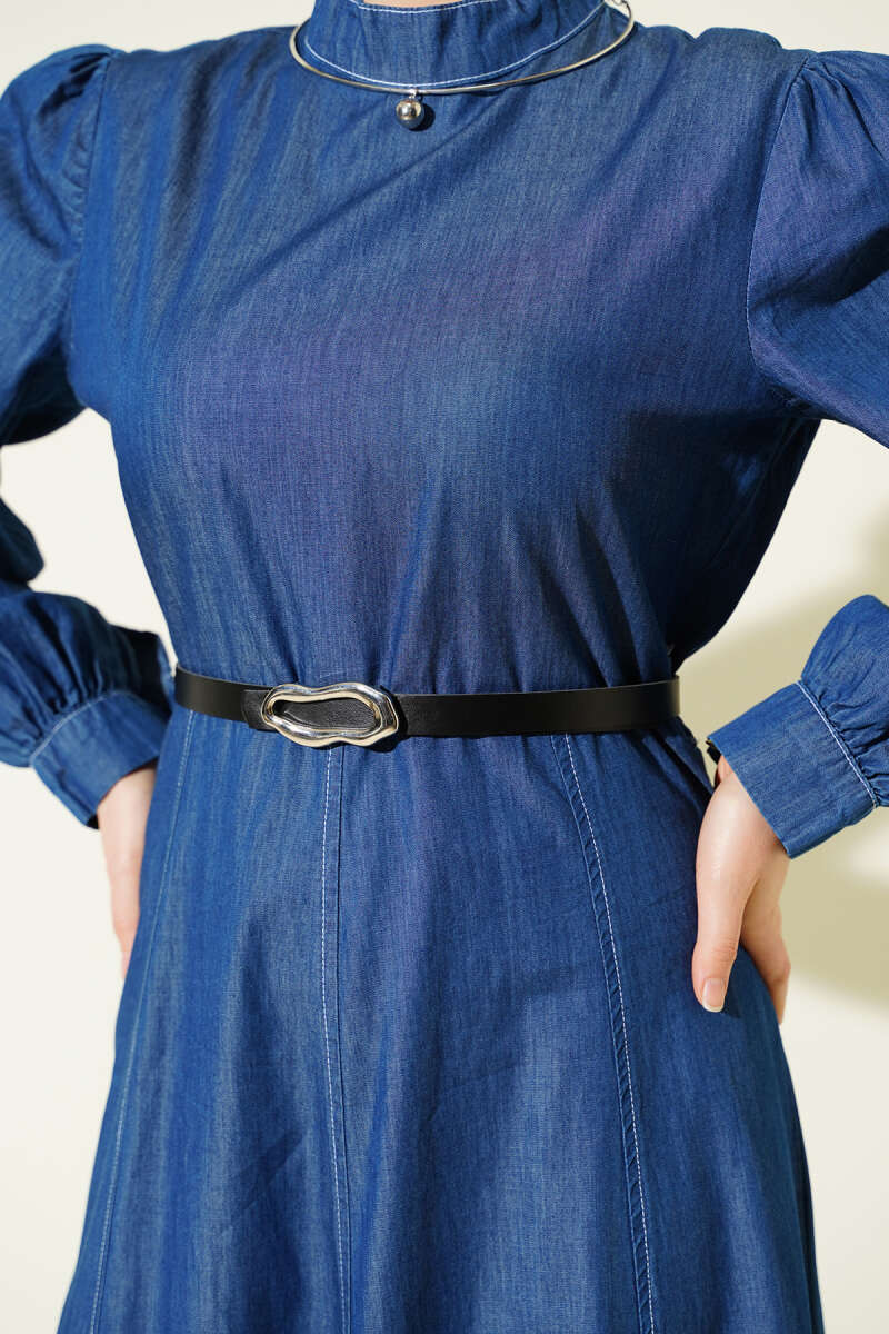 Kemerli Kot Görünümlü Kloş Elbise Mavi