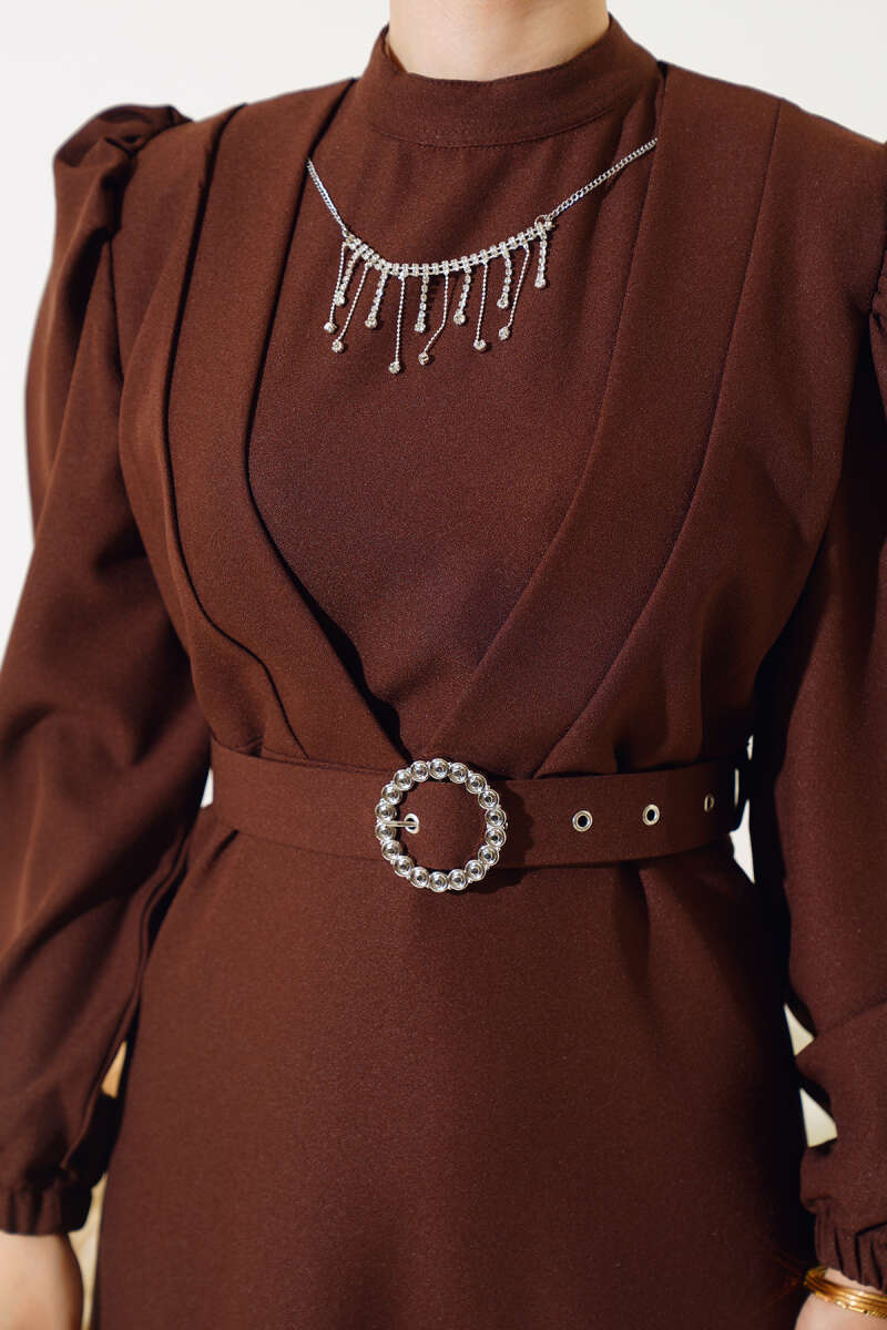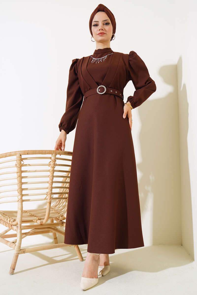 Kuşaklı Ekose Desenli Kloş Elbise Kahve