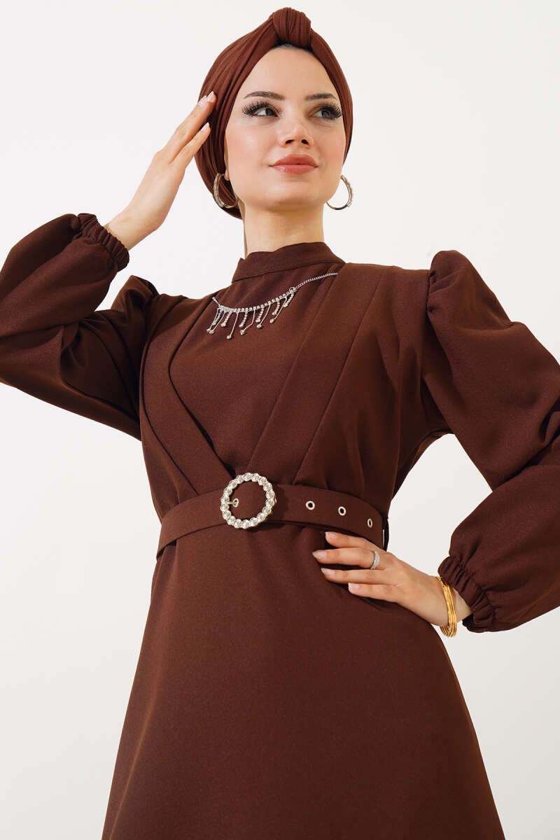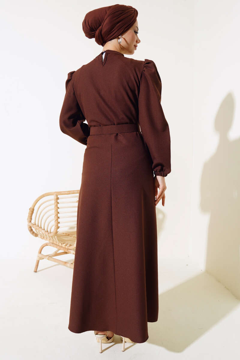 Çizgi Gömlek Garnili Triko Elbise Kahve
