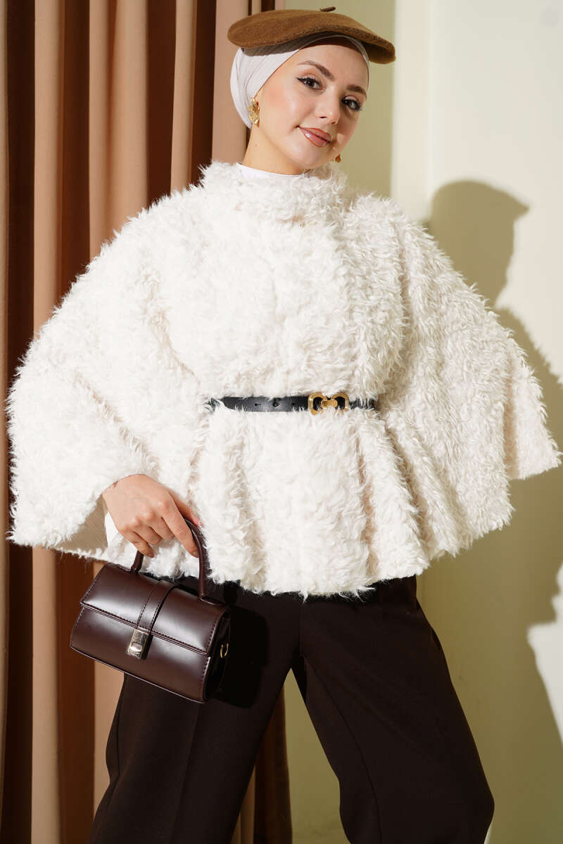 Angora Detaylı Yaka Düğmeli Panço Bej