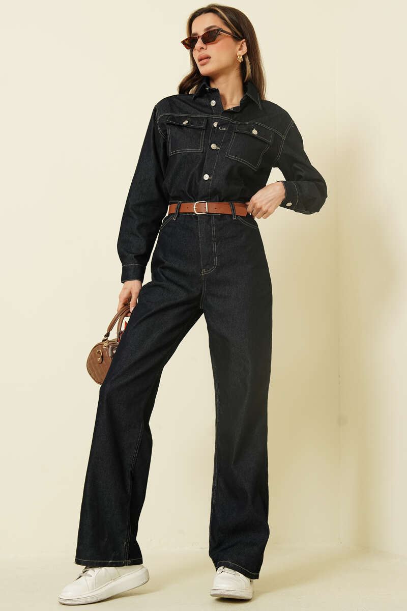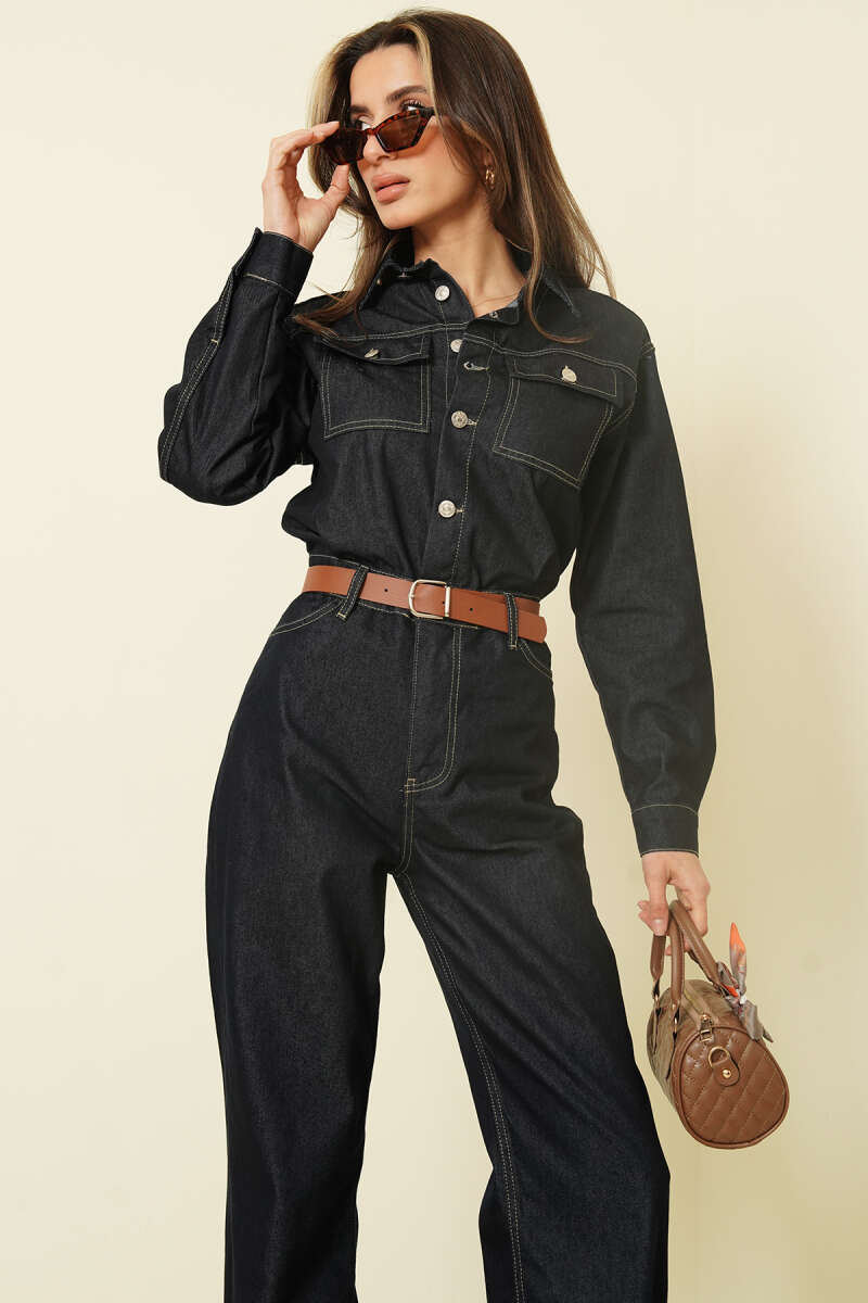 Göğüs Tokalı Uzun Kol Crop Lacivert