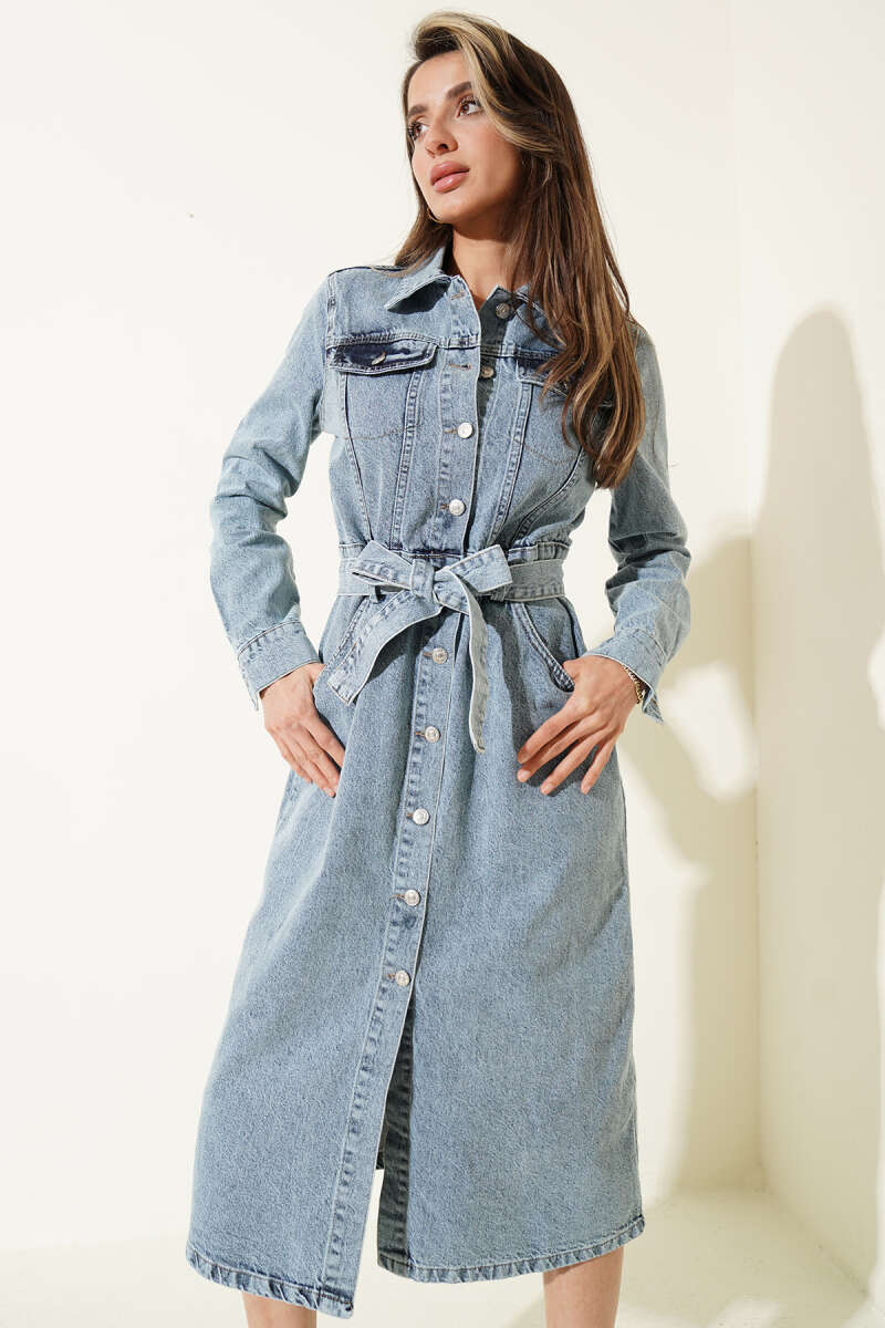 Kemerli Midi Boy Kot Elbise Kot Mavisi