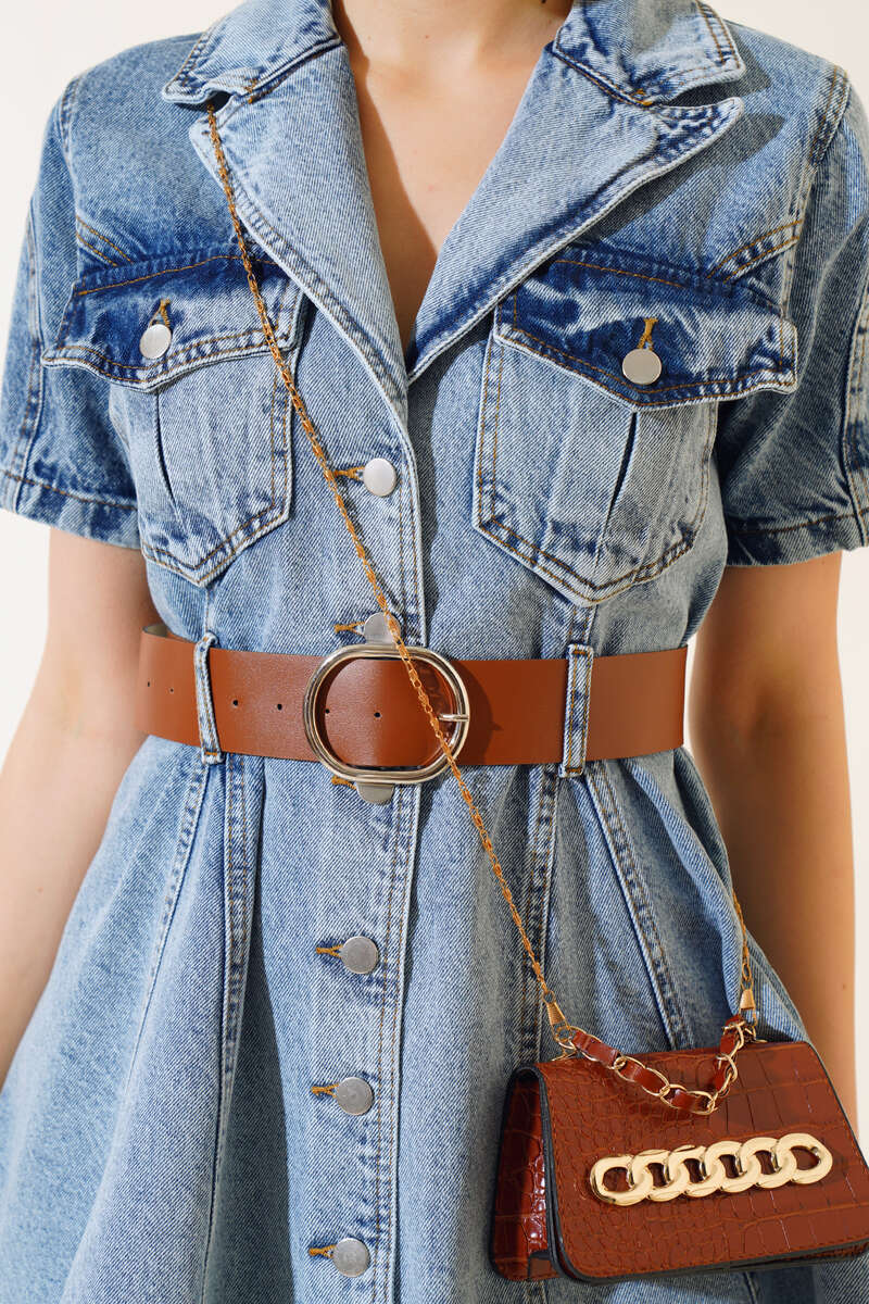Sezonun en trend elbise modelimiz sizlerle beraber. Elbisemiz boydan düğmelidir. Kruvaze yakadır. Elbisemizin göğsünde iki adet kapaklı cebi vardır. İki adet kemer köprüsü olup, kemeri vardır. Sade ve şık kot elbisemiz size çok yakışacak.