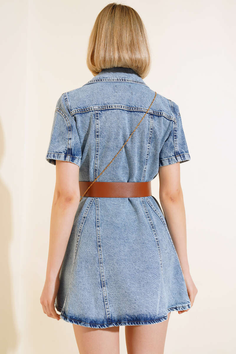 Sezonun en trend elbise modelimiz sizlerle beraber. Elbisemiz boydan düğmelidir. Kruvaze yakadır. Elbisemizin göğsünde iki adet kapaklı cebi vardır. İki adet kemer köprüsü olup, kemeri vardır. Sade ve şık kot elbisemiz size çok yakışacak.