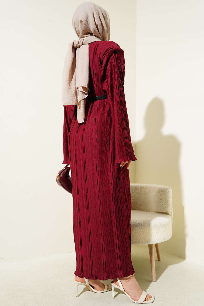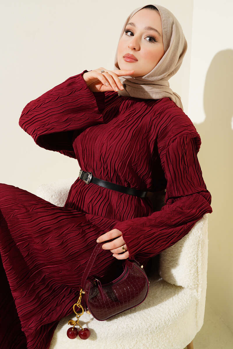 Pelerin Detaylı Pileli Triko Elbise Bordo