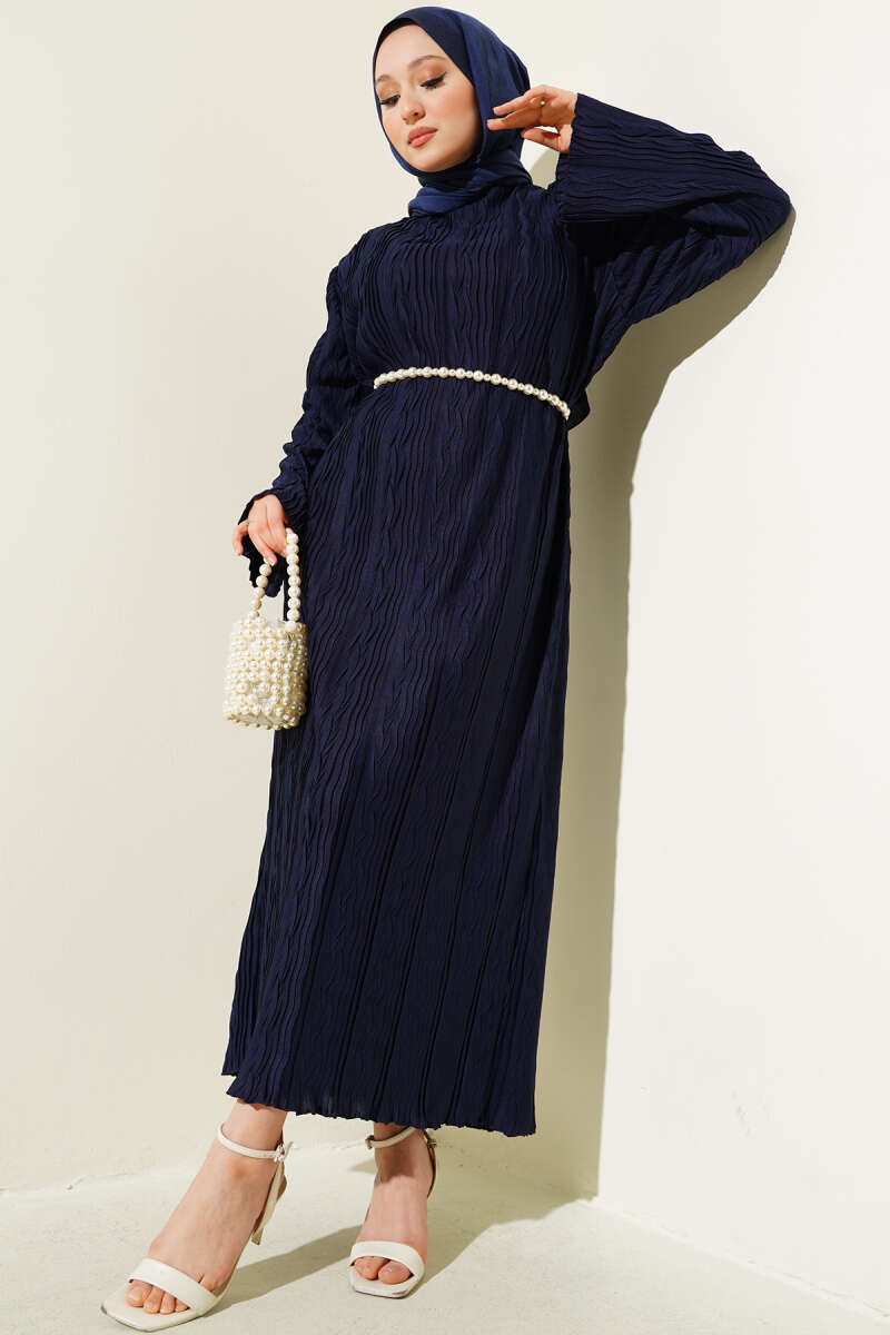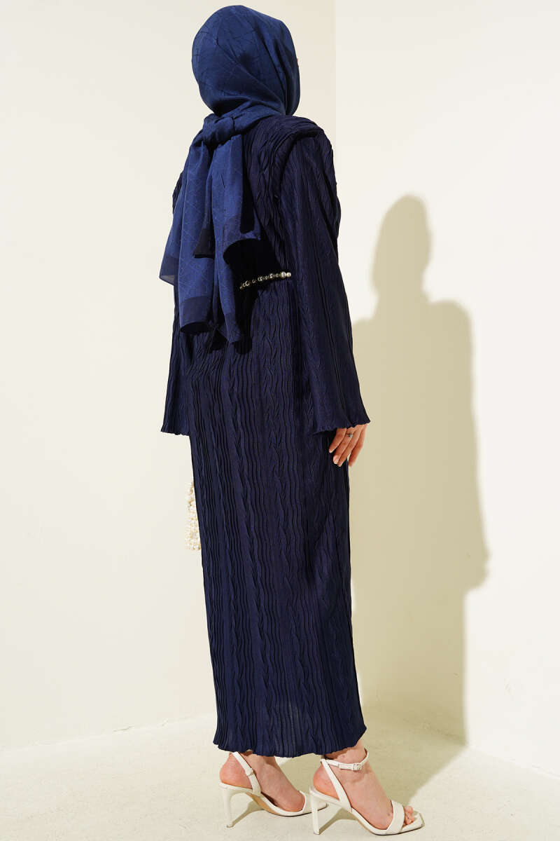 Kol Ucu Kürklü Fitilli Kaşe Elbise Lacivert