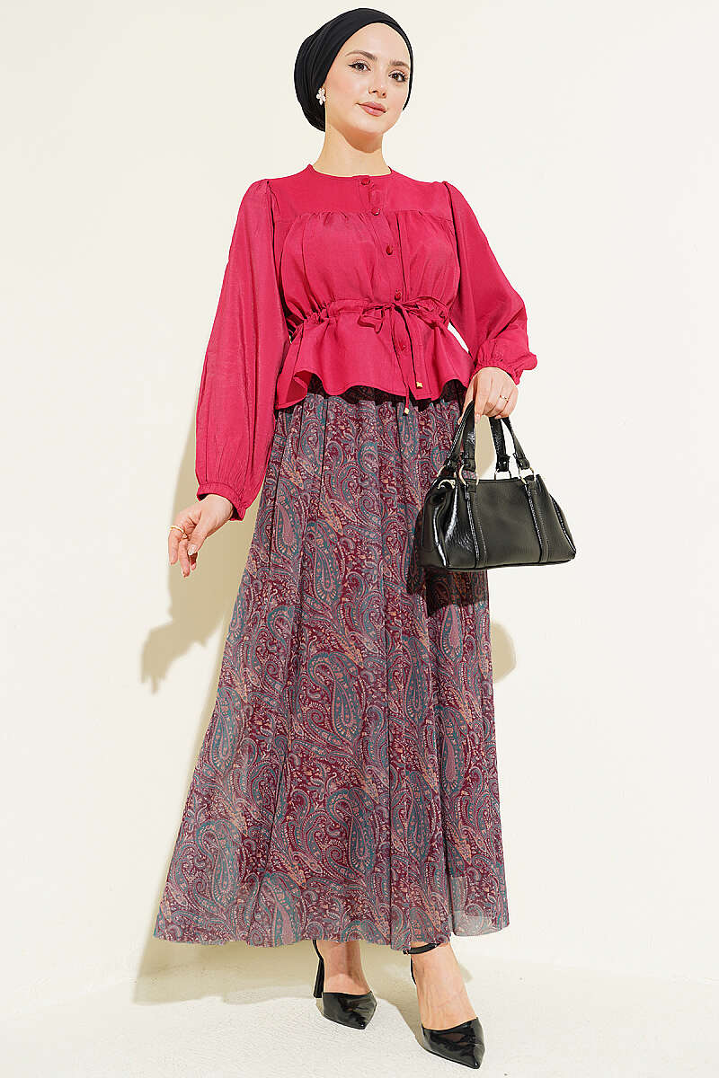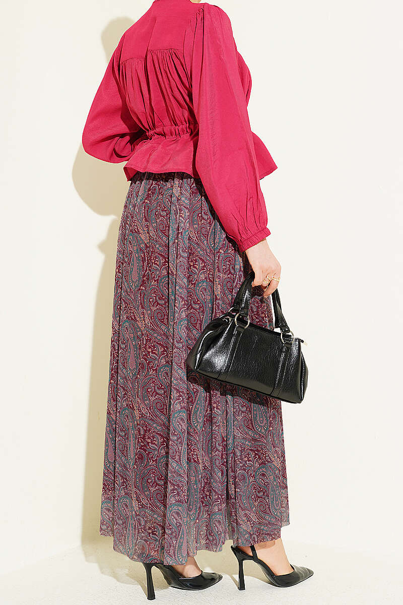 Bu şık şifon etek, geleneksel ve moderni buluşturan zarif paisley (şal) deseni ile hareketli bir görünüm sunar. Akışkan ve hafif yapısıyla gün boyu konfor sağlarken, belindeki kemer detayı silueti vurgulayarak daha formda bir duruş sergiler. Astarlı tasarımı sayesinde güvenli bir kullanım sunan etek, hem günlük kombinlerde hem de özel davetlerde değerlendirilebilecek zamansız bir parçadır.