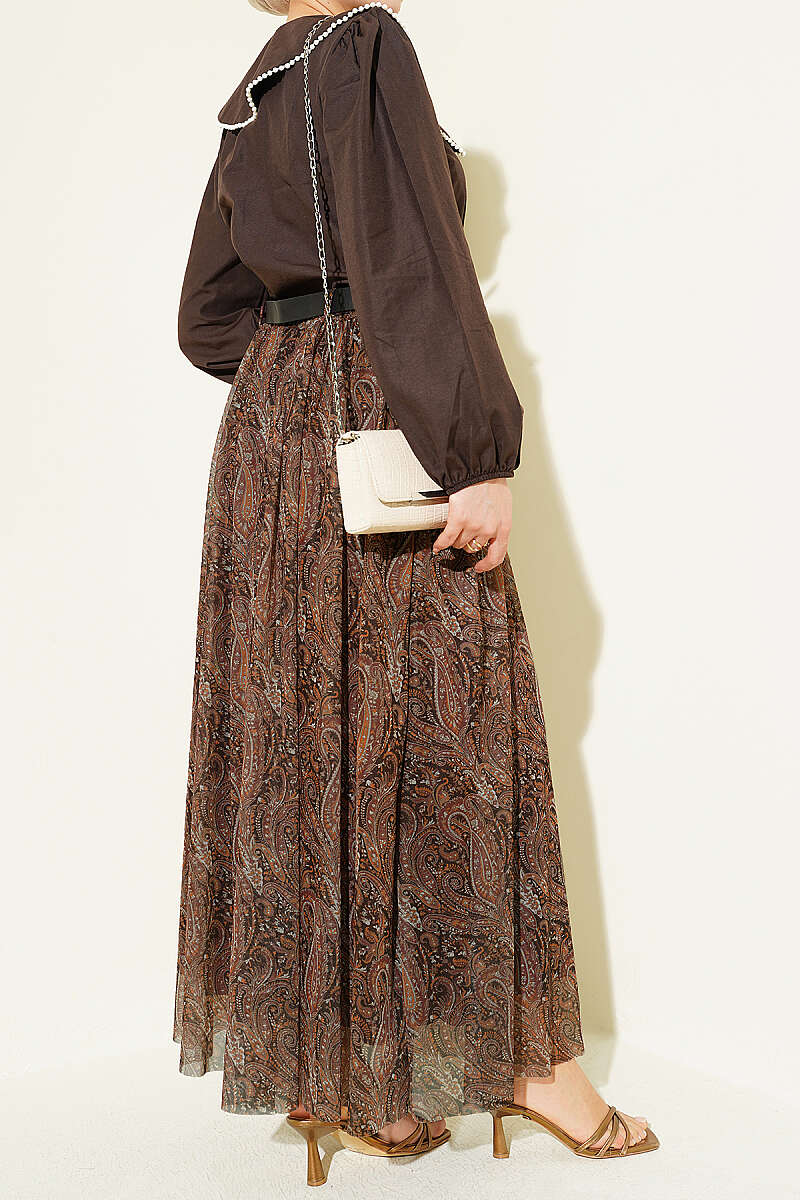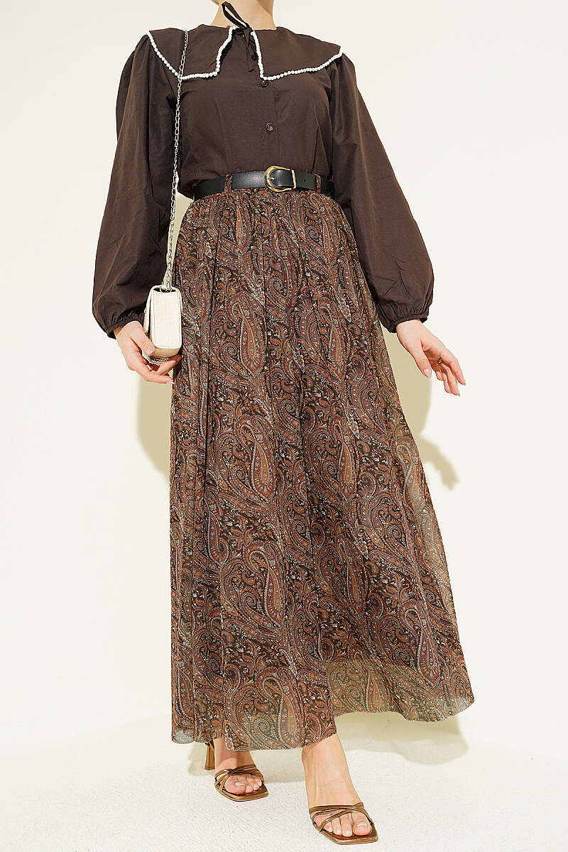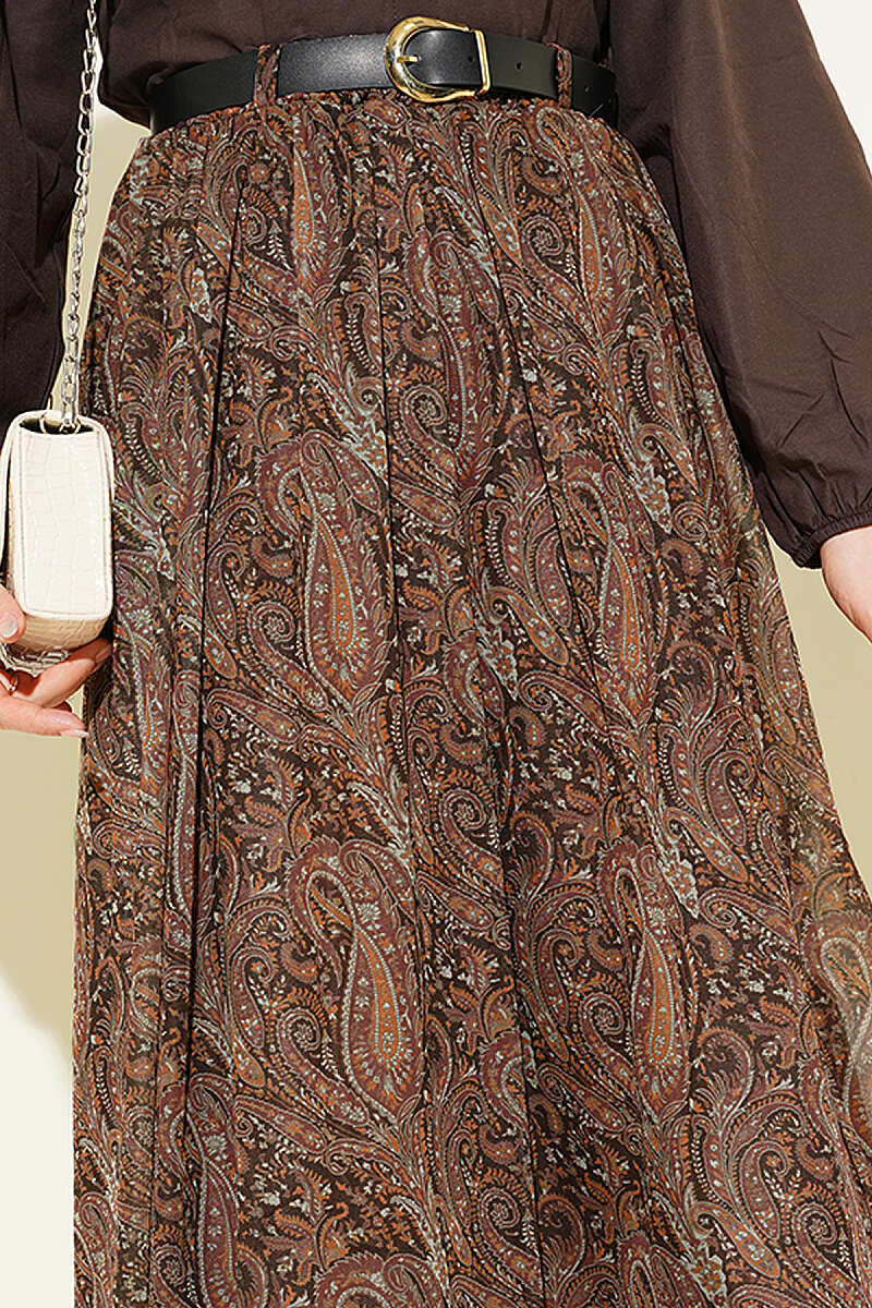 Kemerli Paisley Desen Şifon Etek Zümrüt