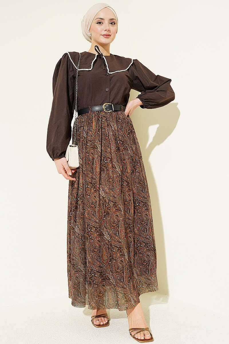 Bu şık şifon etek, geleneksel ve moderni buluşturan zarif paisley (şal) deseni ile hareketli bir görünüm sunar. Akışkan ve hafif yapısıyla gün boyu konfor sağlarken, belindeki kemer detayı silueti vurgulayarak daha formda bir duruş sergiler. Astarlı tasarımı sayesinde güvenli bir kullanım sunan etek, hem günlük kombinlerde hem de özel davetlerde değerlendirilebilecek zamansız bir parçadır.