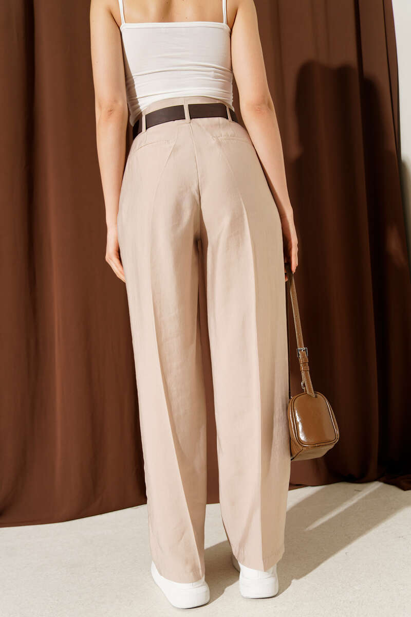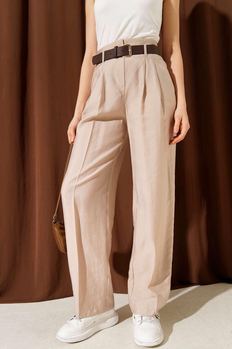 Kemerli Pensli Pantolon Bej