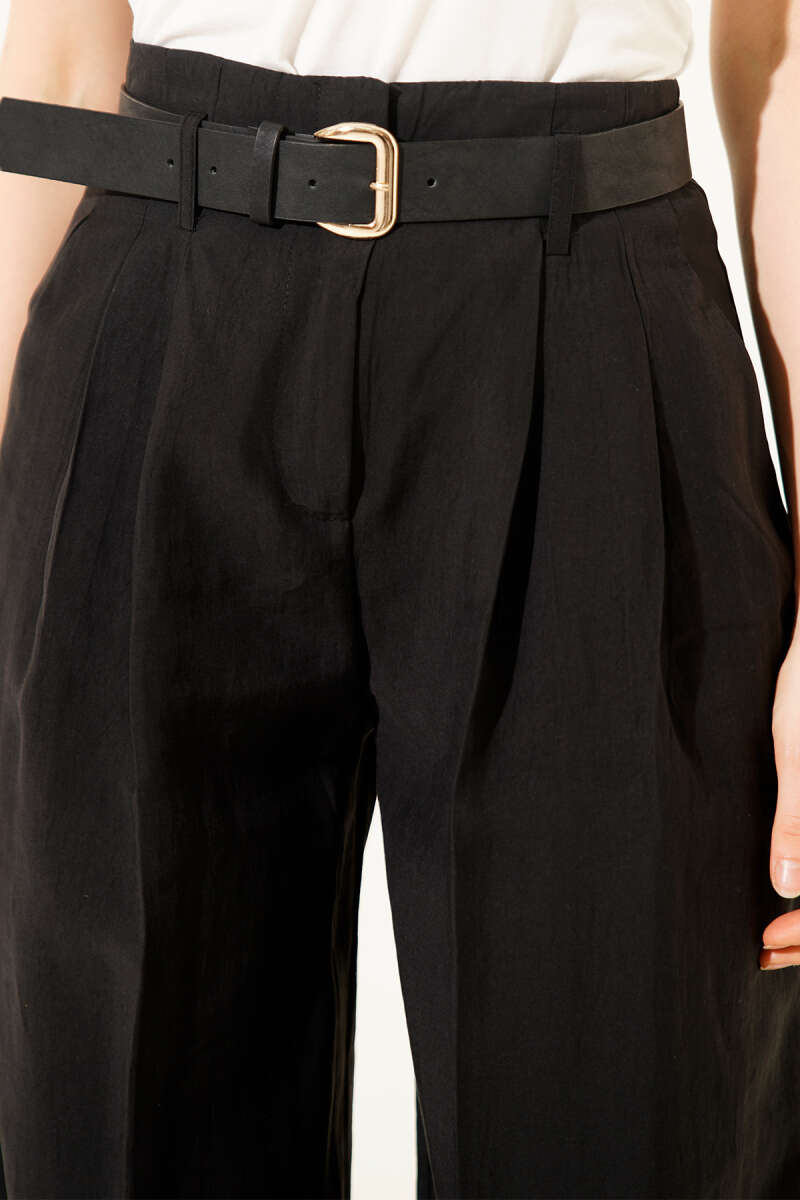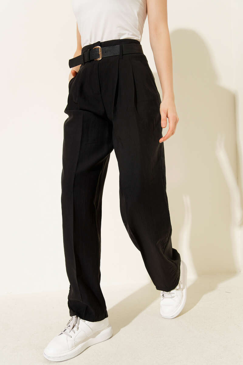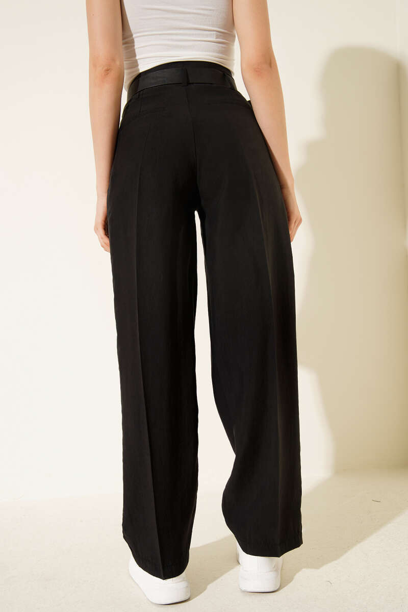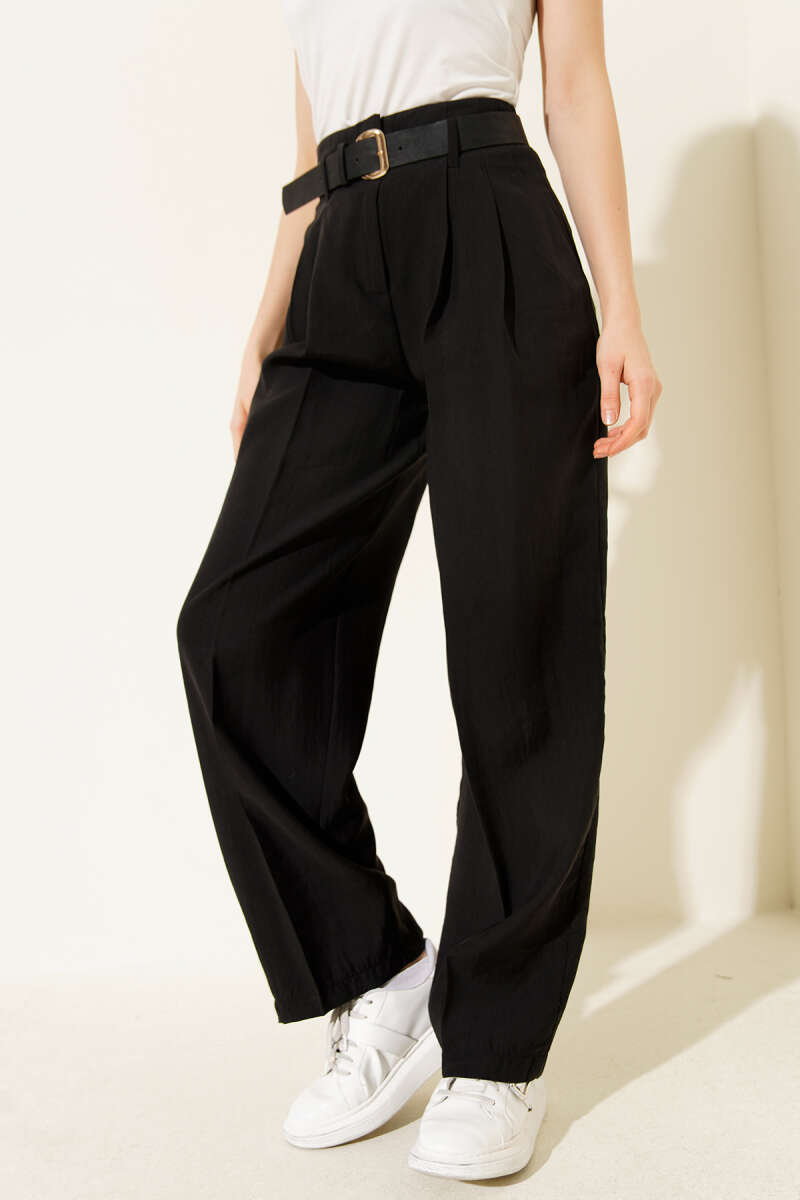 Kemerli Bel Pileli Geniş Paça Pantolon Siyah