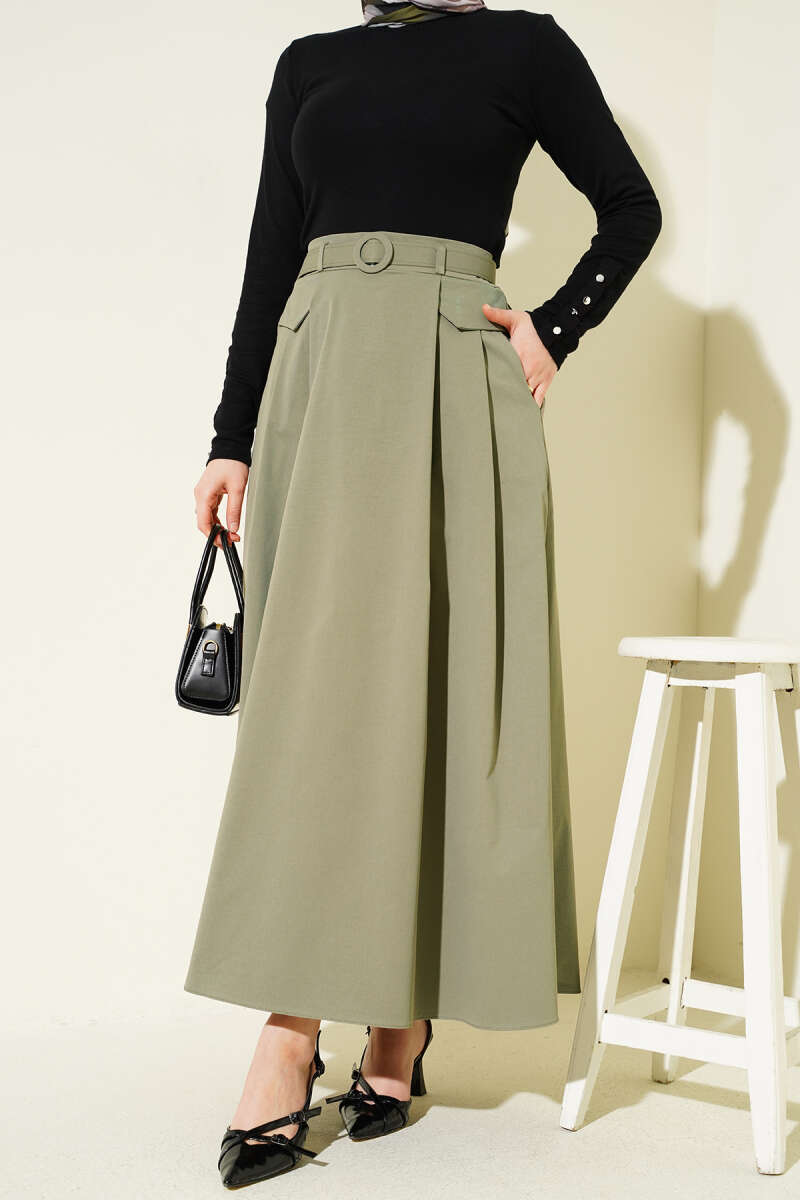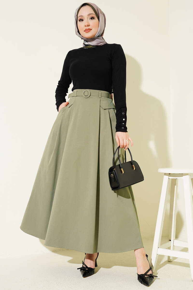 Kemerli Pile Detaylı Cepli Etek Çağla Yeşili