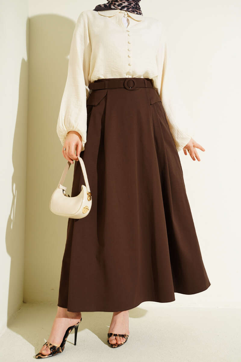 Geniş Kemerli Pileli Tensel Etek Kahve