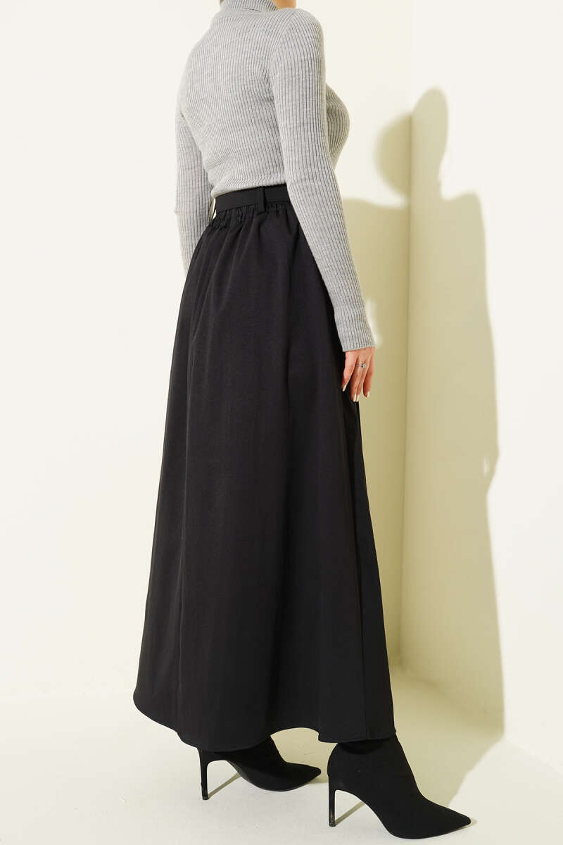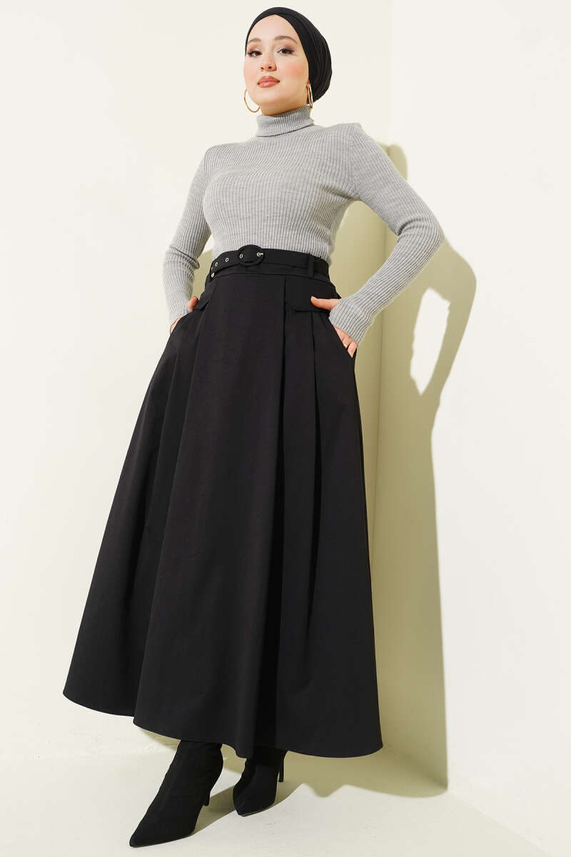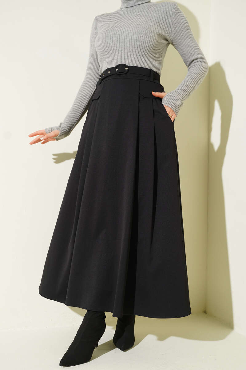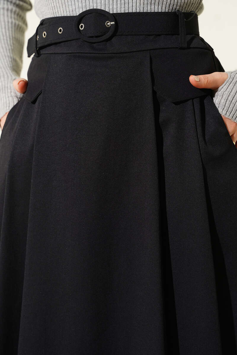 Kemer Tokalı Düğmeli Etek Siyah