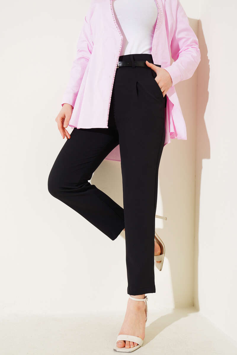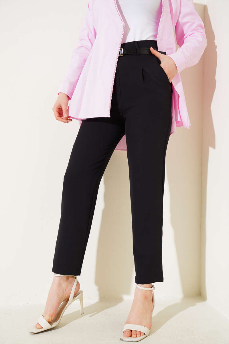 Kemerli Pileli Dar Paça Pantolon Siyah
