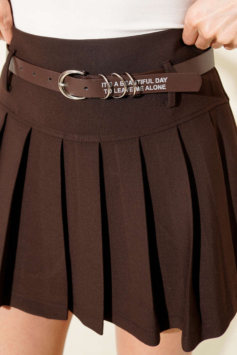 Kemerli Pileli Mini Etek Kahve
