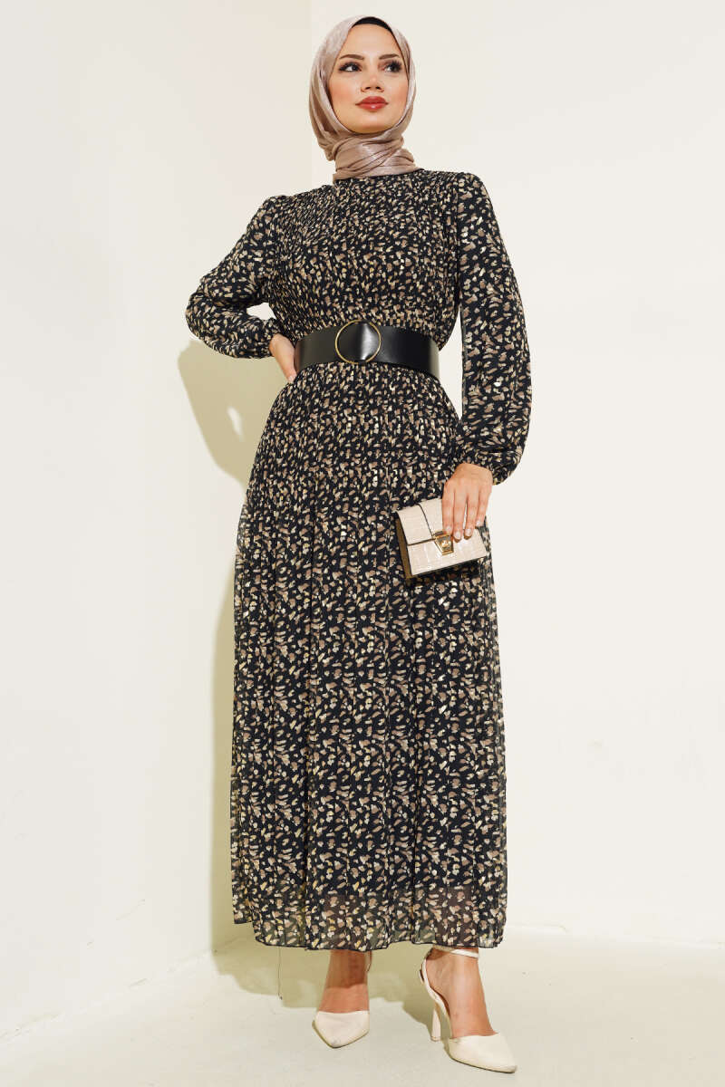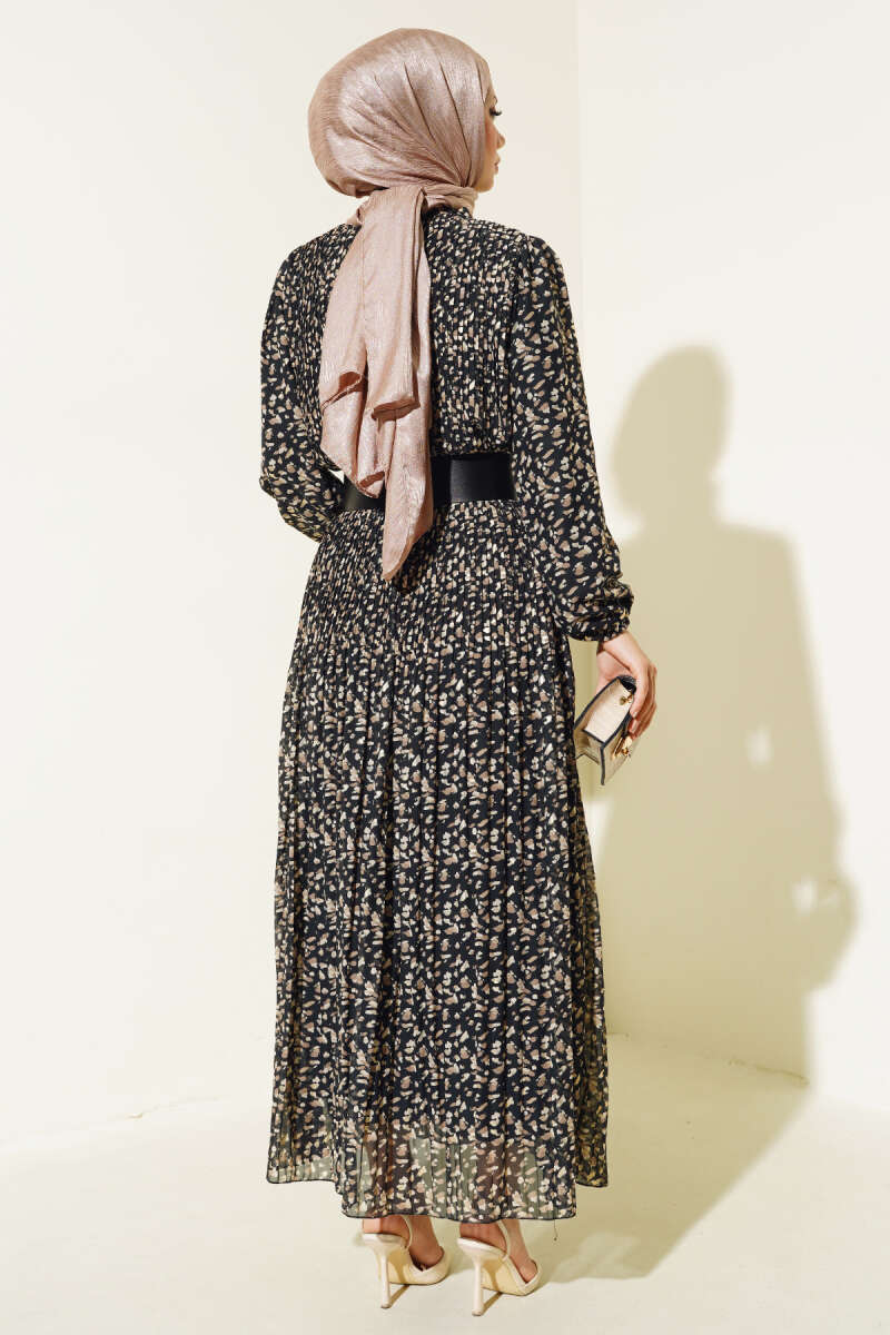 Çiçek Motifli Tül Pelerinli Abiye Elbise Siyah