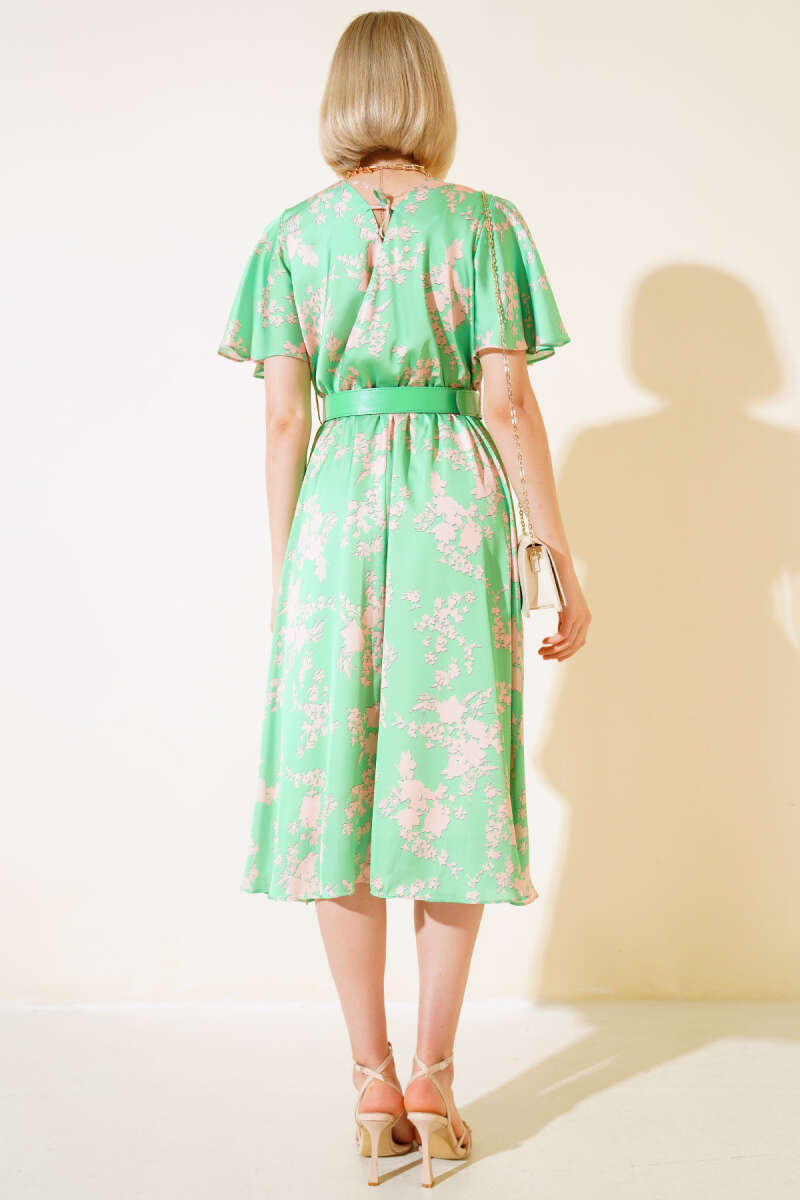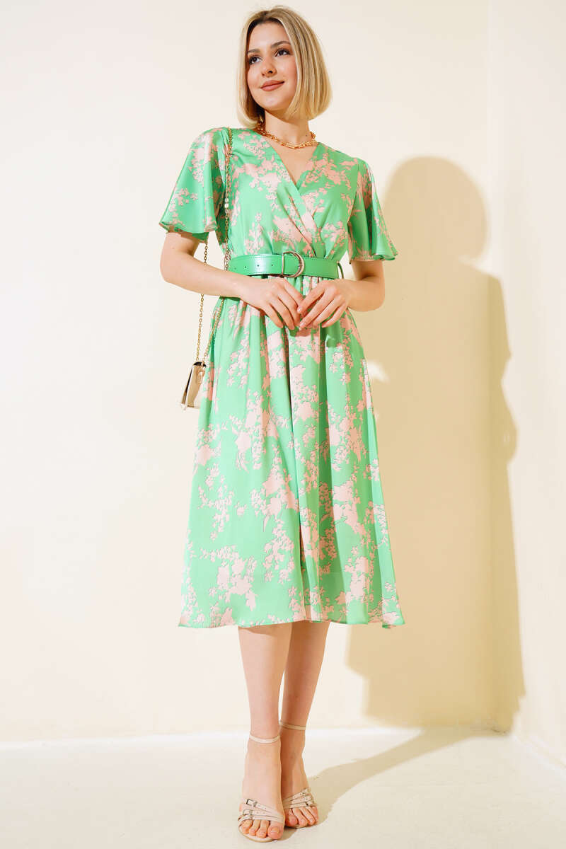 Desenli Yarım Düğme Detaylı Elbise Yeşil