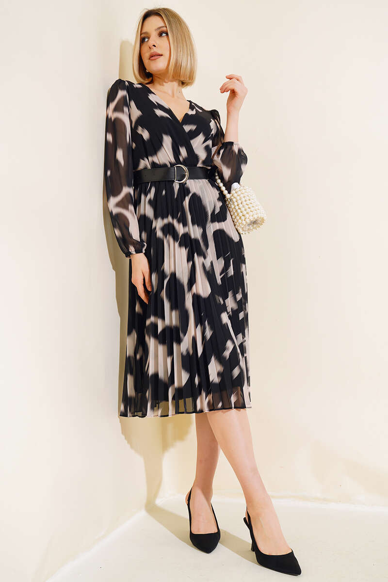 Yeni sezon elbise modelimiz sizlerle beraber. Elbisemiz kruvaze yakadır. Uzun tül kolludur. Kol bileği ev beli lastiklidir. Elbisemizin eteği pilelidir. Astarlıdır. Belinde iki adet kemer köprüsü olup, kemeri vardır. Şık ve zarif elbisemiz özel günleriniz için tasarlandı.