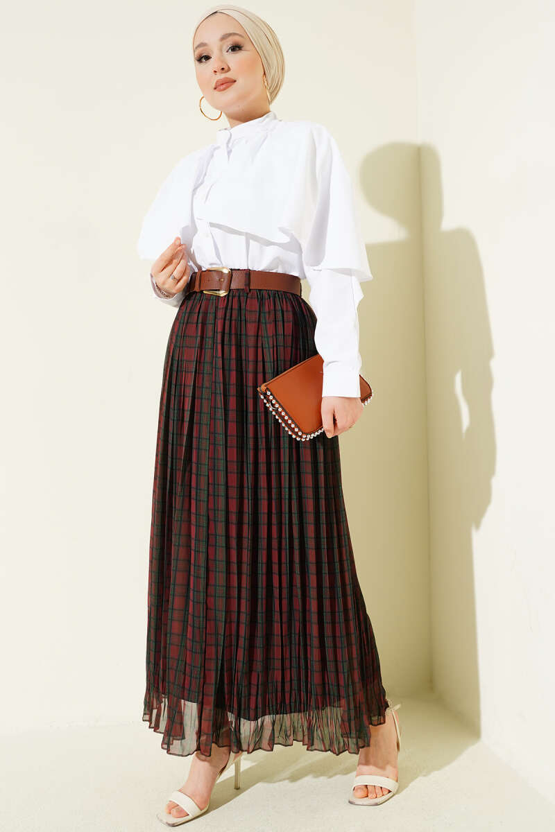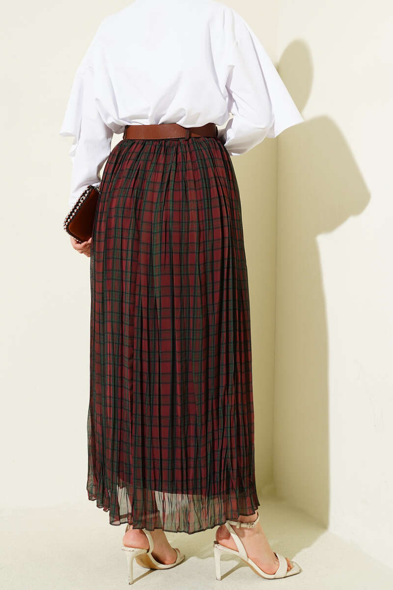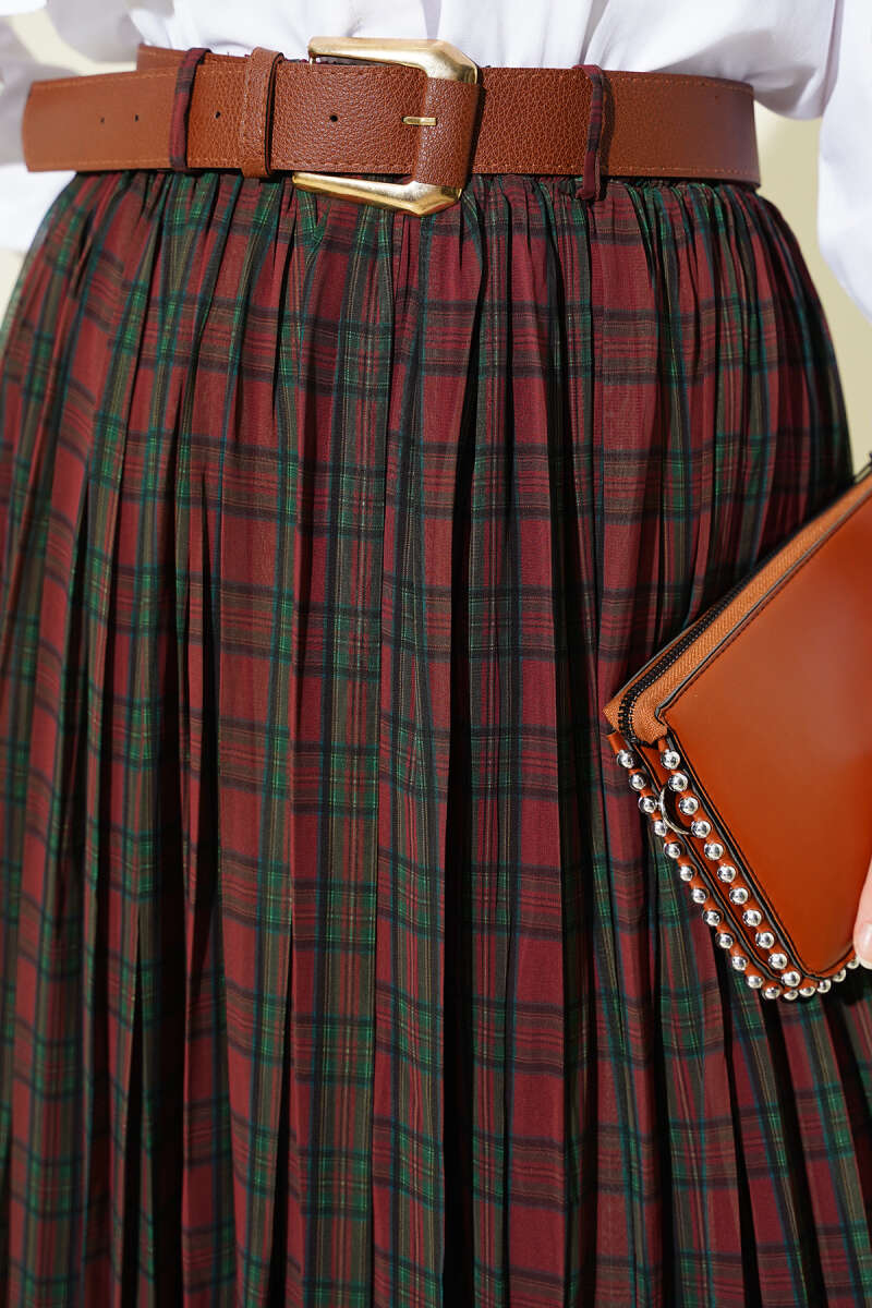 Kemerli Sık Pileli Ekoseli Etek Kahve