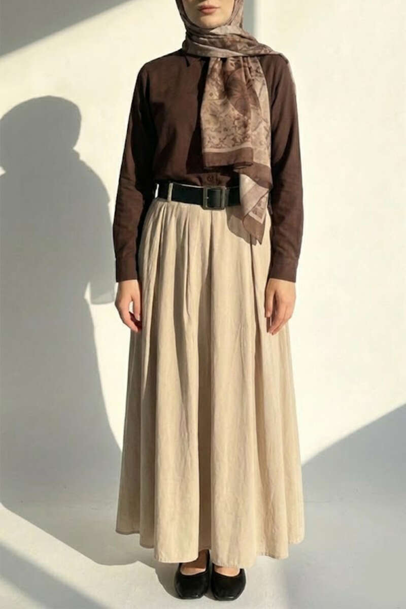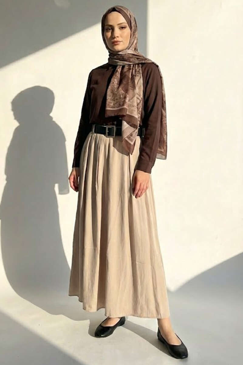 Kemerli Tensel Pileli Etek Bej